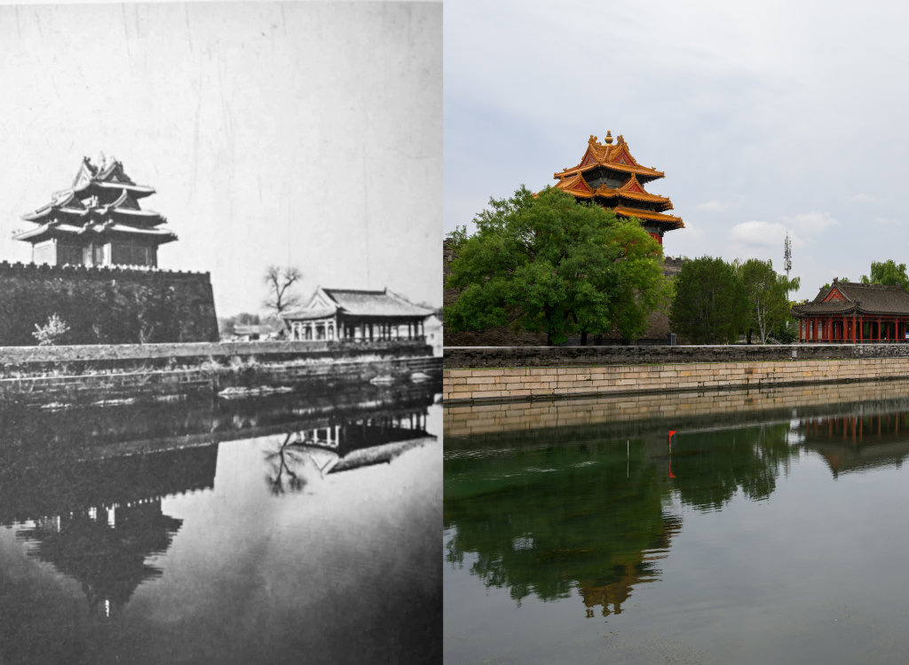 拼版照片:左图为20世纪初拍摄的角楼(故宫博物院供图);右图为2025年10月10日拍摄的角楼(新华社记者金良快 摄)。