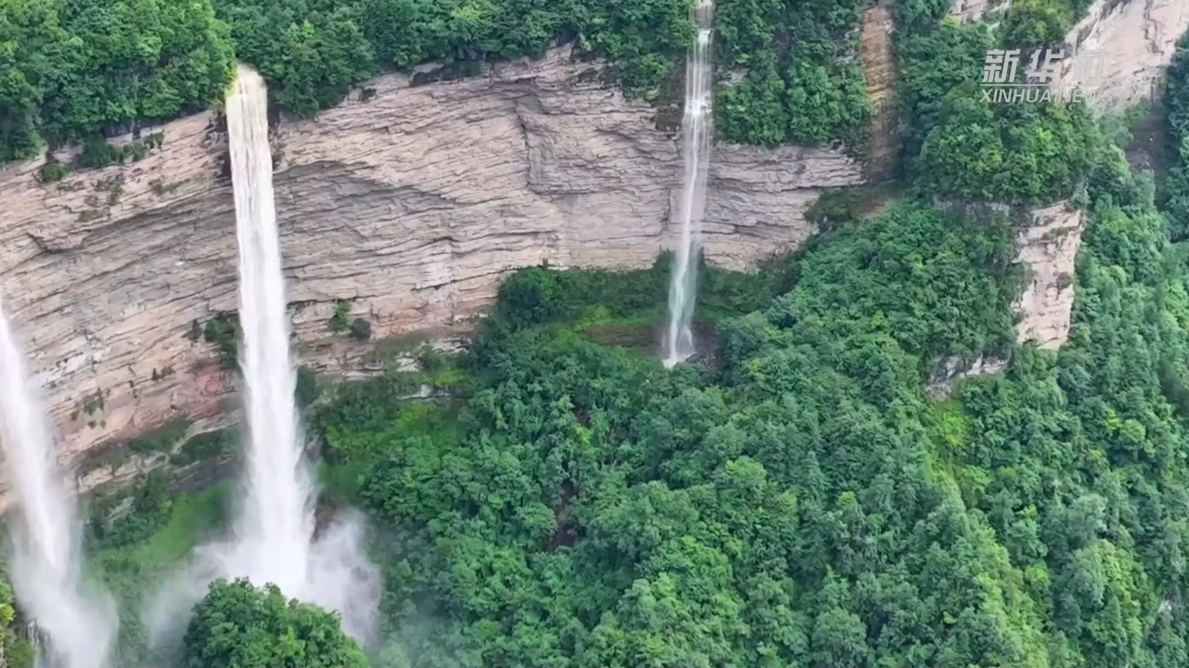 雨歇云未散,四川广元旺苍盐井河峡谷上数十条瀑布从百米崖壁奔涌而下,汇成“一峡十瀑”的壮丽奇观。沿着陡峭的峡壁,高瀑顺势而下,仿若银河倾泻,又似玉龙奔腾。