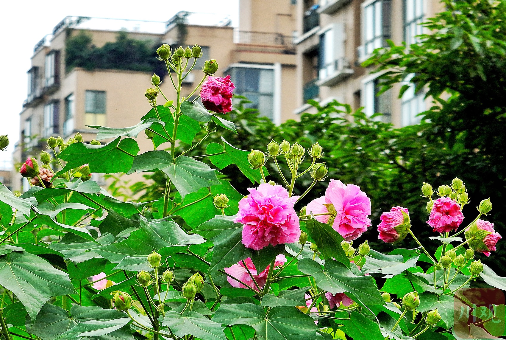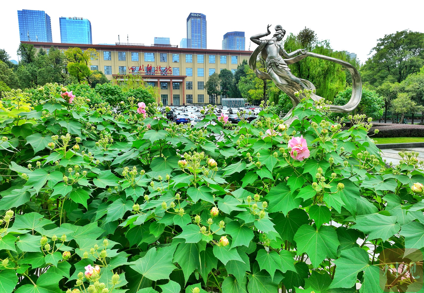 市中心后子门“芙蓉花仙”雕塑下,“醉芙蓉”品种的花骨朵渐上枝头。