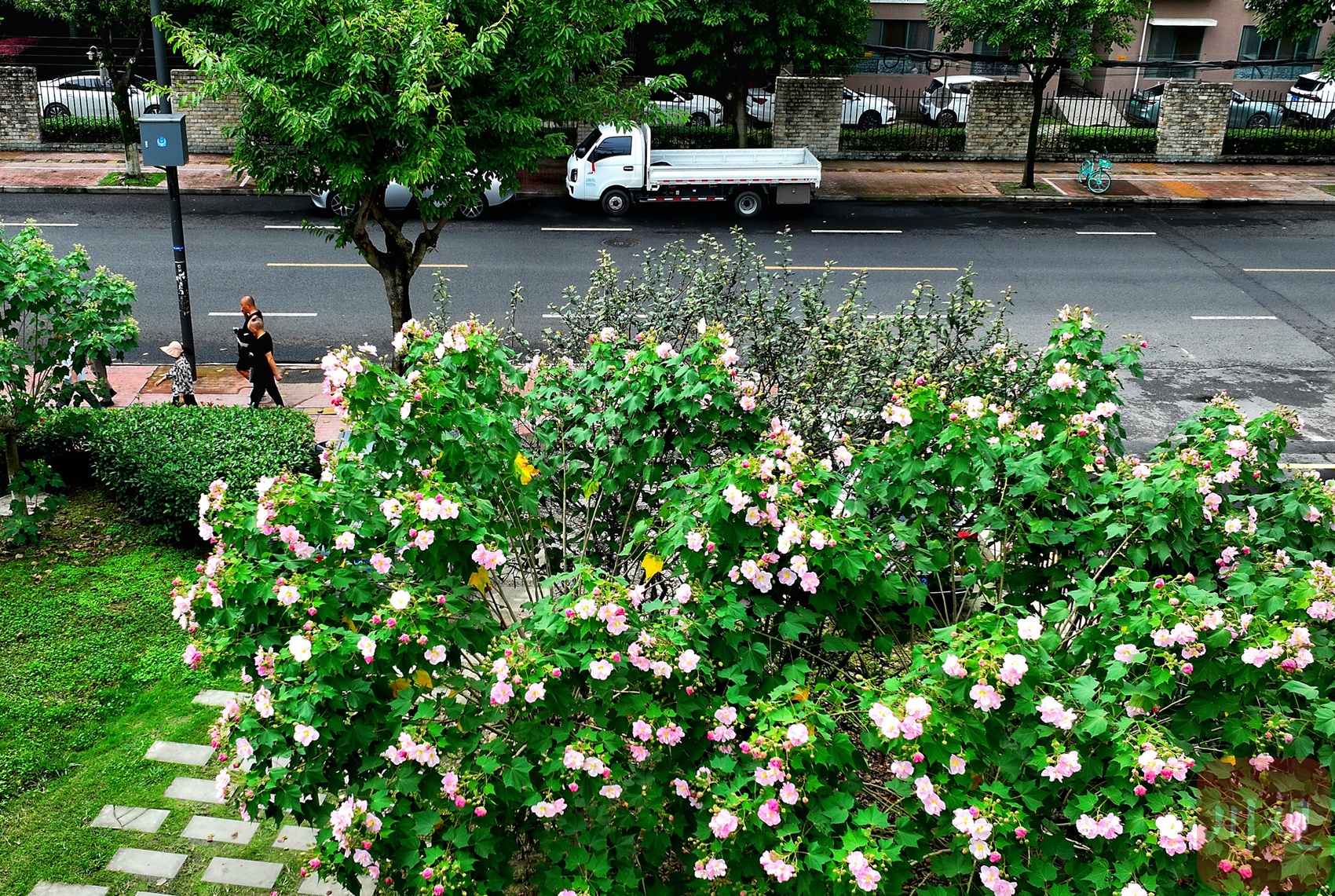不远处的杉板桥路,景致同样迷人。粉白相间的单瓣芙蓉花一丛丛、一簇簇,为街道增添了几分灵动与柔美。过往路人见状,纷纷放慢脚步,欣赏这份秋日限定的浪漫。