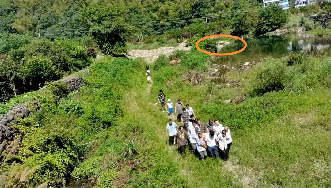 她家住在天台县泳溪乡的一处村庄,家门口附近有条小河流,天旱的时候水流时断时续,水深不过膝,岸边的草地经常有人去散步,踩踏出了一条明显的路。
