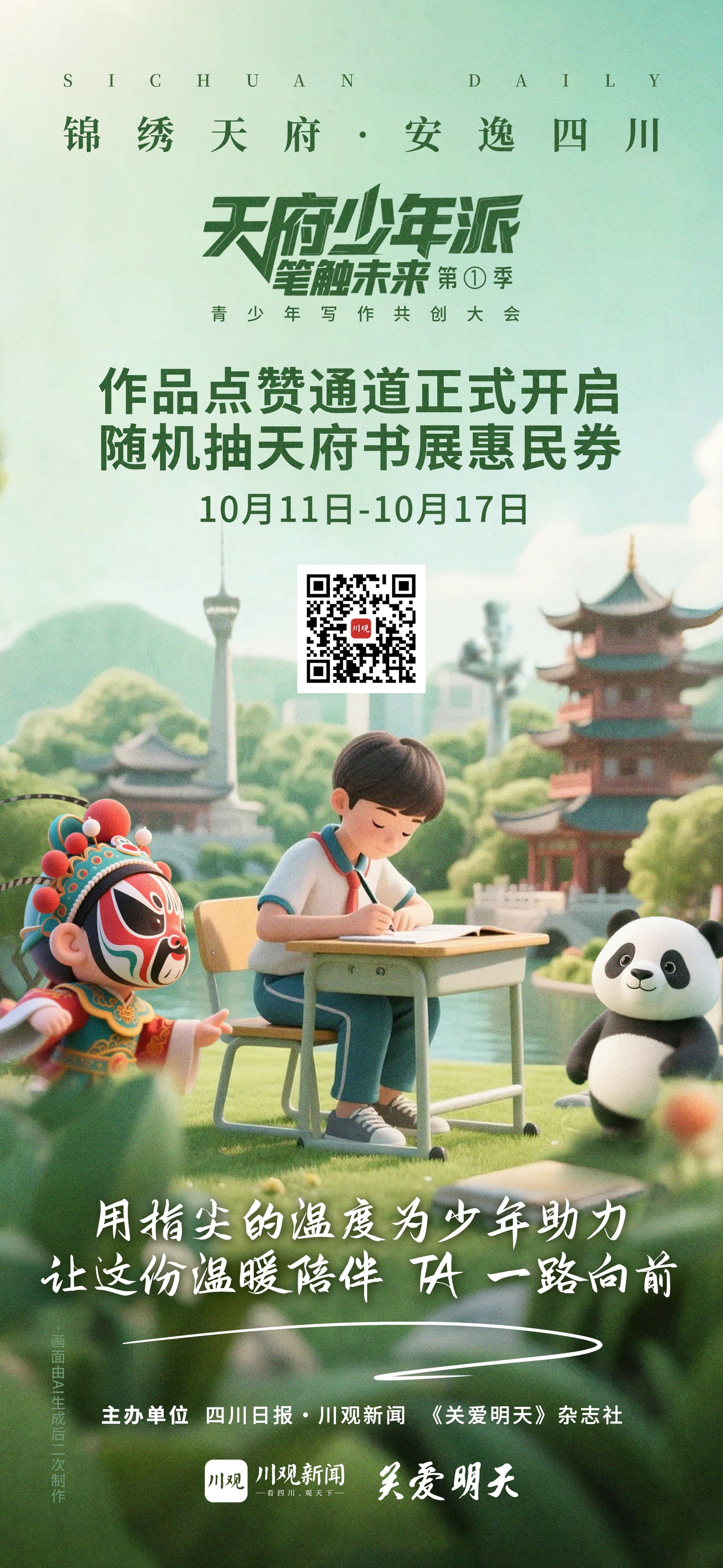 7月1日,由四川日报社、《关爱明天》杂志社联合主办的“天府少年派・笔触未来”青少年写作共创大会(第一季)正式启动,本季主题为“锦绣天府·安逸四川”,邀请全国中小学生用青春的笔触描绘四川的自然之美、人文之韵、发展之变,让世界听见少年眼中的天府故事。