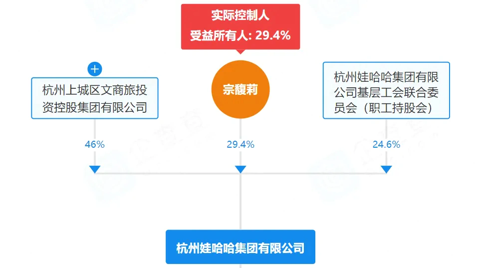 商标之争的背后是娃哈哈复杂的股权结构。企查查显示,第一大股东是国企杭州上城区文商旅投资控股集团有限公司,持股46%,实际控制人宗馥莉持股29.40%,为第二大股东;剩余股份由娃哈哈职工持股会持股