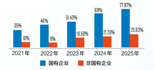 从企业属性看,四川辖区国有上市企业与非国有上市企业的差距仍然较显著。统计显示,自2021年以来,国有企业的ESG报告披露率持续上升,国有企业在政策推动下整体水平明显领先非国有企业;非国有企业在非强制披露环境下仍有大部分持观望态度。