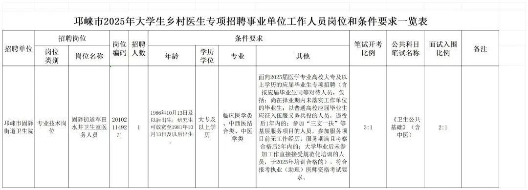 成都市郫都区卫生健康局下属事业单位面向社会公开招聘大学生乡村医生2名。