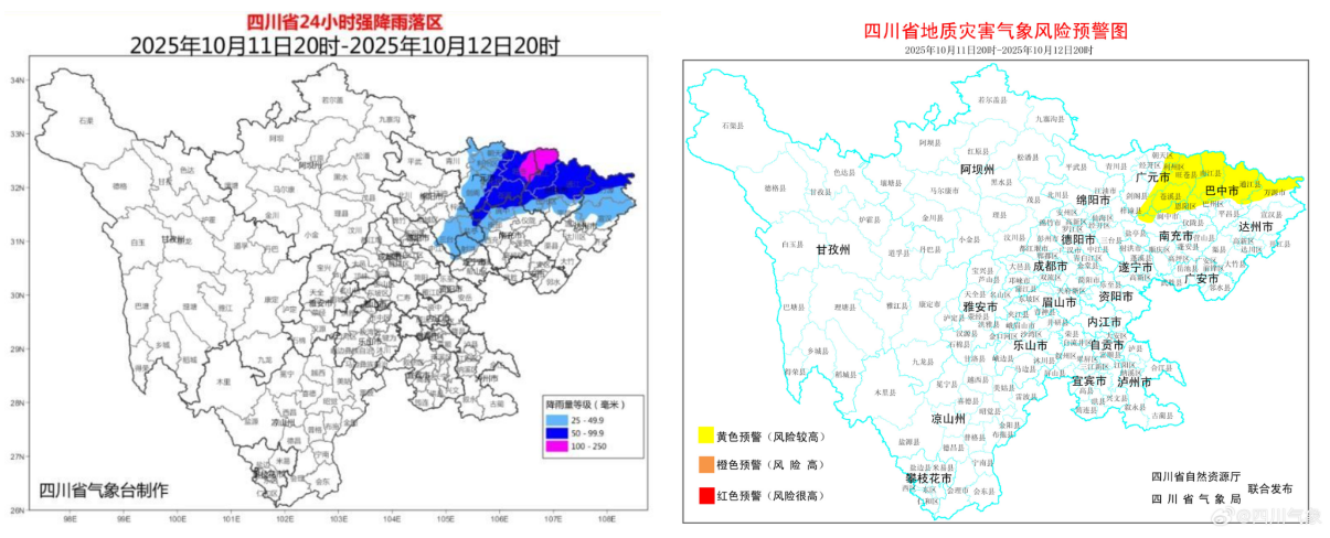 随后,省自然资源厅、省气象局联合发布地质灾害气象风险预警:10月11日20时到10月12日20时,巴中大部,广元东部,南充、达州2市北部发生地质灾害的风险较高。请上述地区加强地质灾害防范工作。