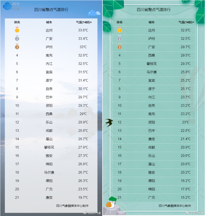四川各城市10月10日(左)与10月11日(右)14时实况气温对比图