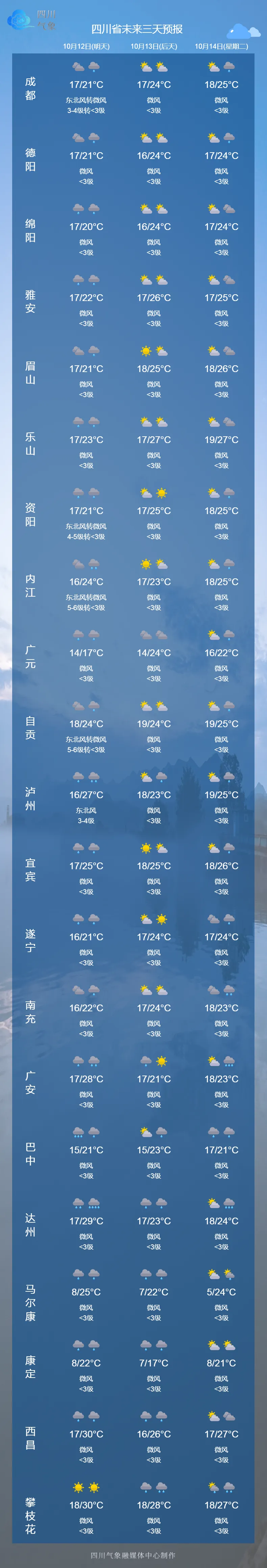 今天(10月11日)15时50分,四川省气象台发布暴雨蓝色预警:10月11日20时到12日20时,巴中和广元东部、达州北部、南充西部、绵阳东部和遂宁北部有大雨到暴雨(雨量40~80毫米),局地大暴雨(雨量120~160毫米),最大小时雨强20~50毫米。受冷空气影响,盆地中部、北部有4—6级偏北风,局地可达7级或以上。