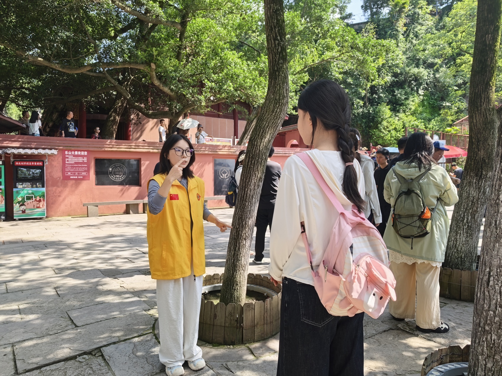 乐山大佛景区,志愿者正在为残障人士进行手语解说。