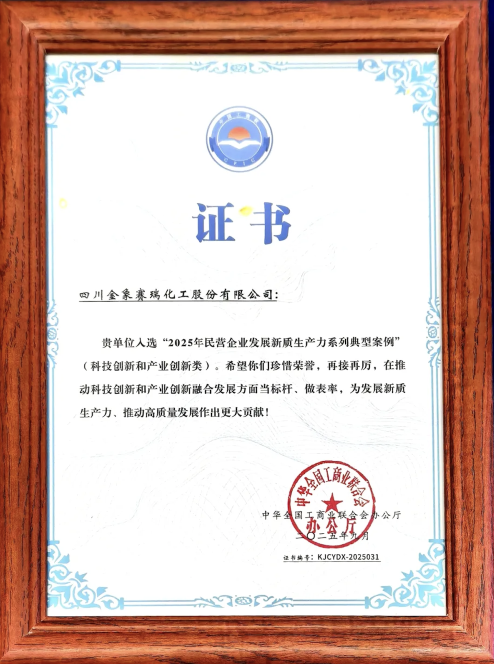 日前,在2025民营经济创新发展大会暨知名民企助力陕西高质量发展大会上,全国工商联发布了《2025研发投入前1000家民营企业创新状况报告》及“2025年民营企业发展新质生产力典型案例”等名单。记者获悉,来自眉山市的四川金象赛瑞化工股份有限公司(简称“金象赛瑞”)脱颖而出,获评“2025年民营企业发展新质生产力系列典型案例”(科技创新和产业创新类),成为全省唯一获此殊荣的民企。