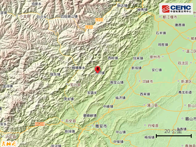 周边县城:震中距宝兴县29公里、距邛崃市37公里、距芦山县40公里、距大邑县42公里、距名山区46公里,距雅安市53公里,距成都市96公里。
