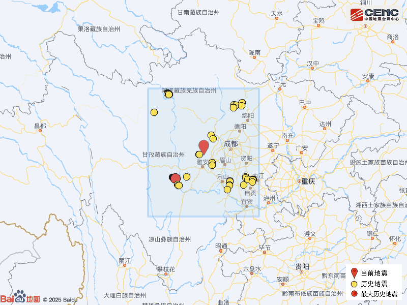 历史地震:根据中国地震台网速报目录,震中周边200公里内近5年来发生3级以上地震共179次,最大地震是2022年9月5日在四川甘孜州泸定县发生的6.8级地震(距离本次震中139公里),按震级大小前50次历史地震分布如图。