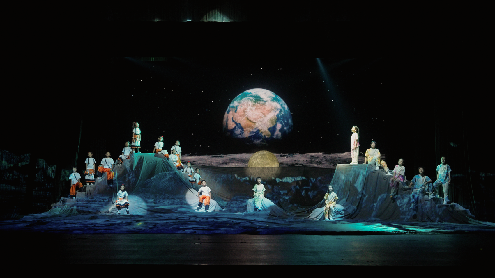 “我们想让这首歌回到千百年前,回到山河湖海、星辰宇宙中的求索与叩问。”本次《玉盘》的舞美设计紧扣“从地向天、由外而内”的情感线索。第一段主歌以地球场景为主,通过投影呈现屋檐、山川、湖海等自然意象;从间奏起,舞台转向星空,孩子们仿佛徜徉于银河,在回望地球的画面中完成对自我内心的叩问。服装方面,彝族元素与现代剪裁相结合,汉族儿童服饰则采用彩色泼墨的设计,传递写意与自然之美。整个舞台力图在简约中见深意,在写实中藏诗意,构建出一幅跨越时空的“问月图卷”。