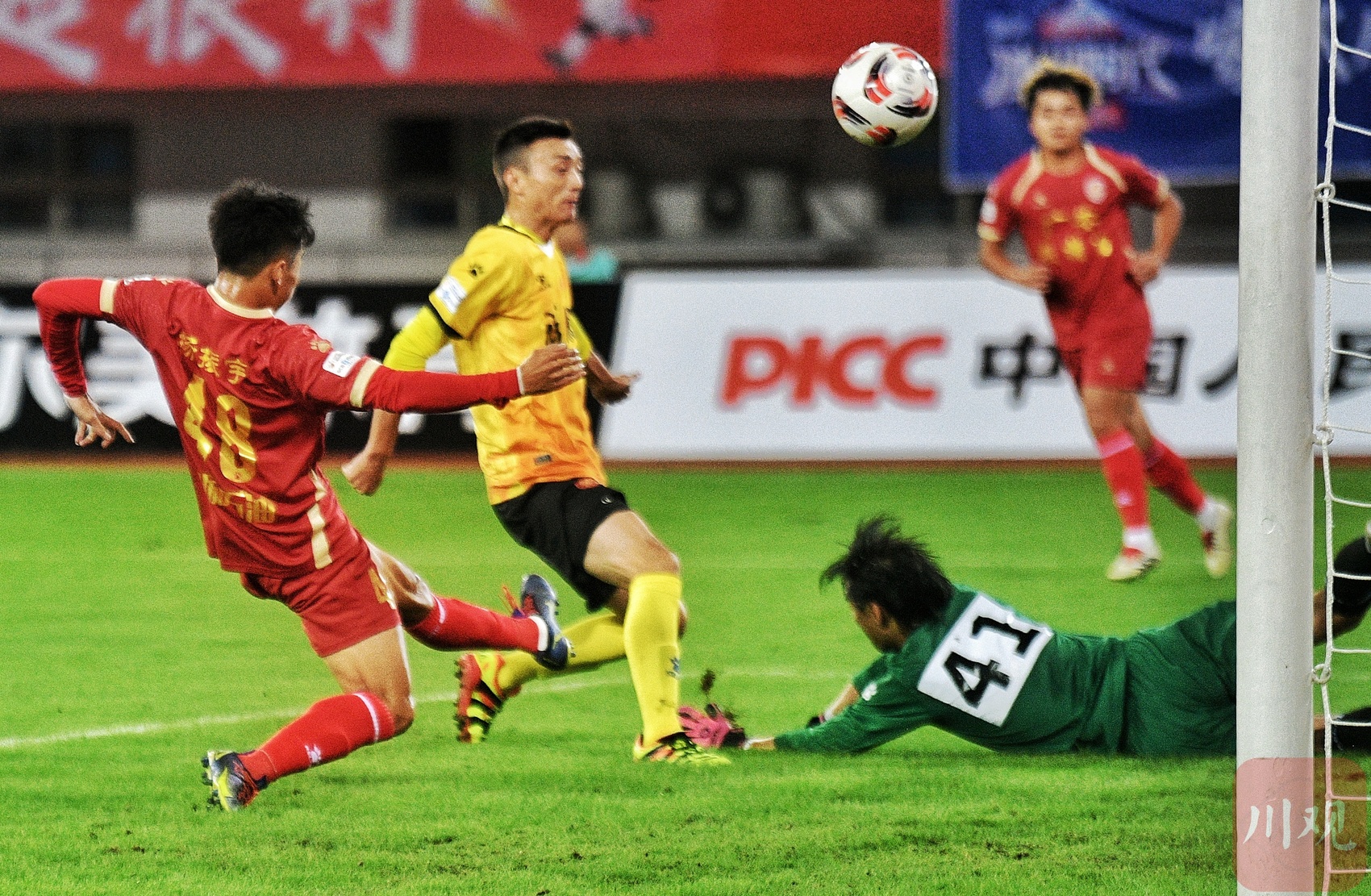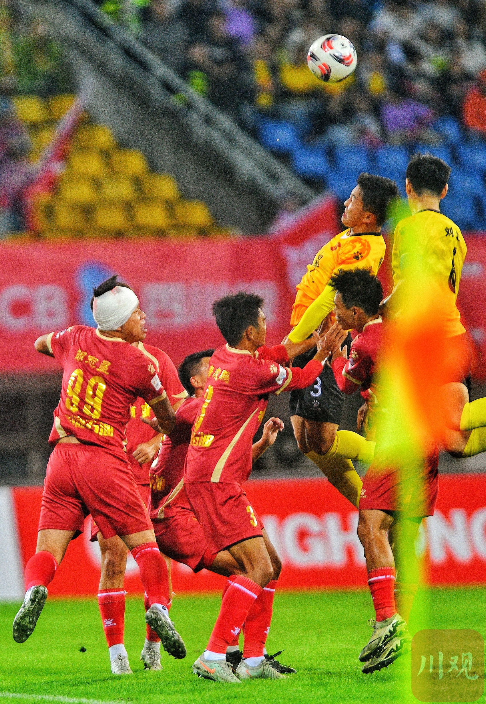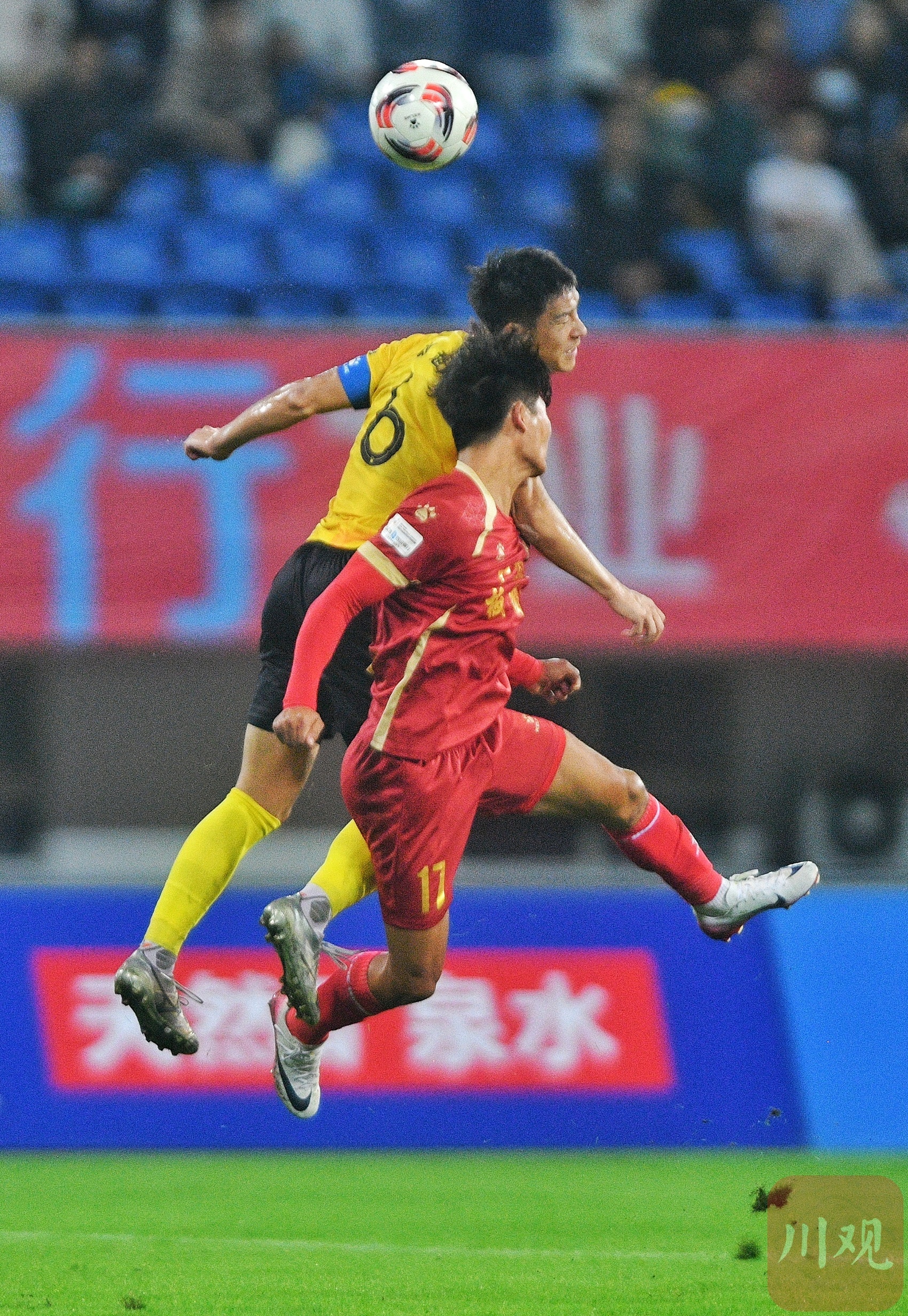 双方队员中场争顶(黄衣为成都锦城队员)。