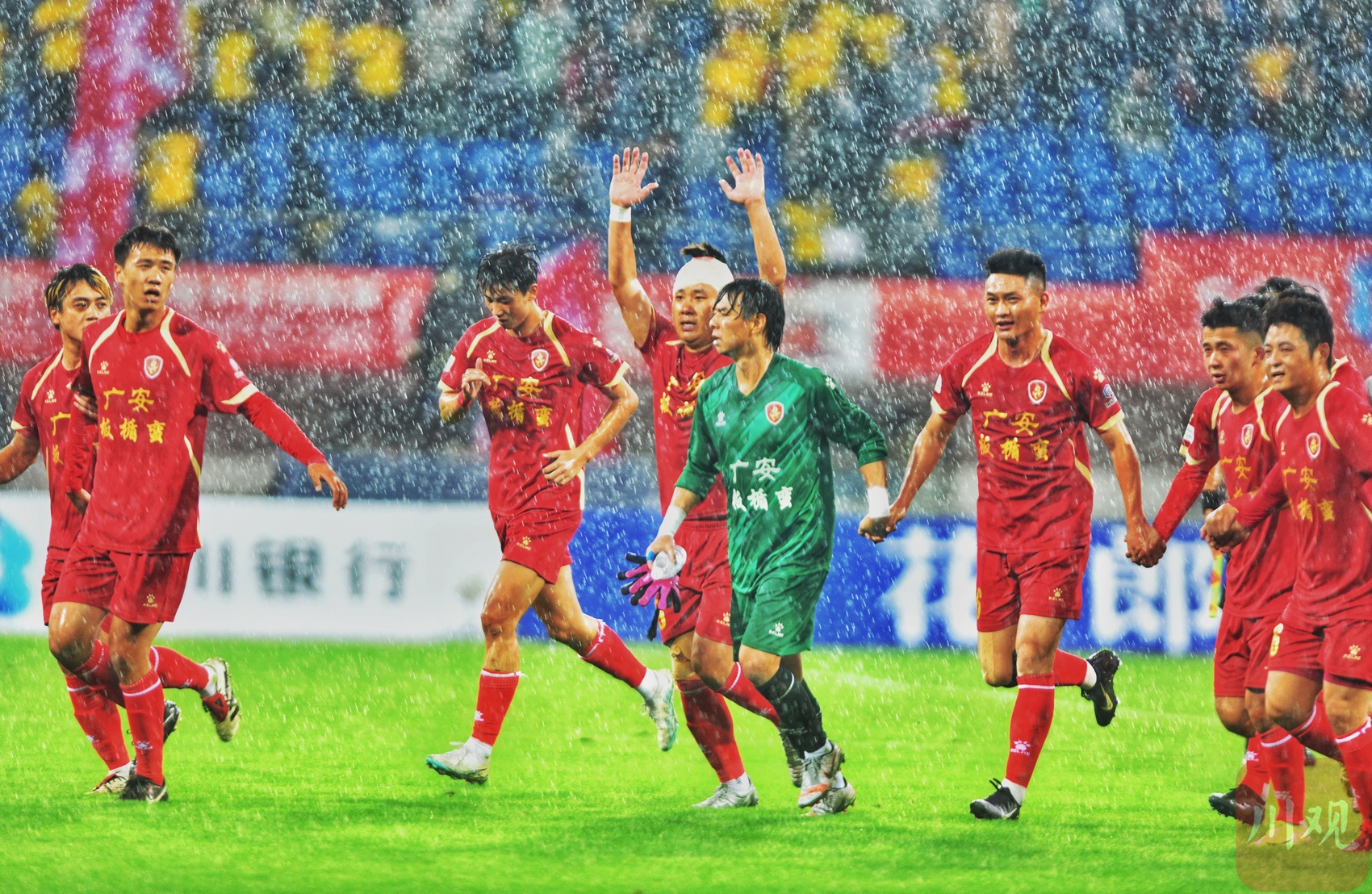 赛后冒着雨,广安板板楯蛮队答谢球迷。