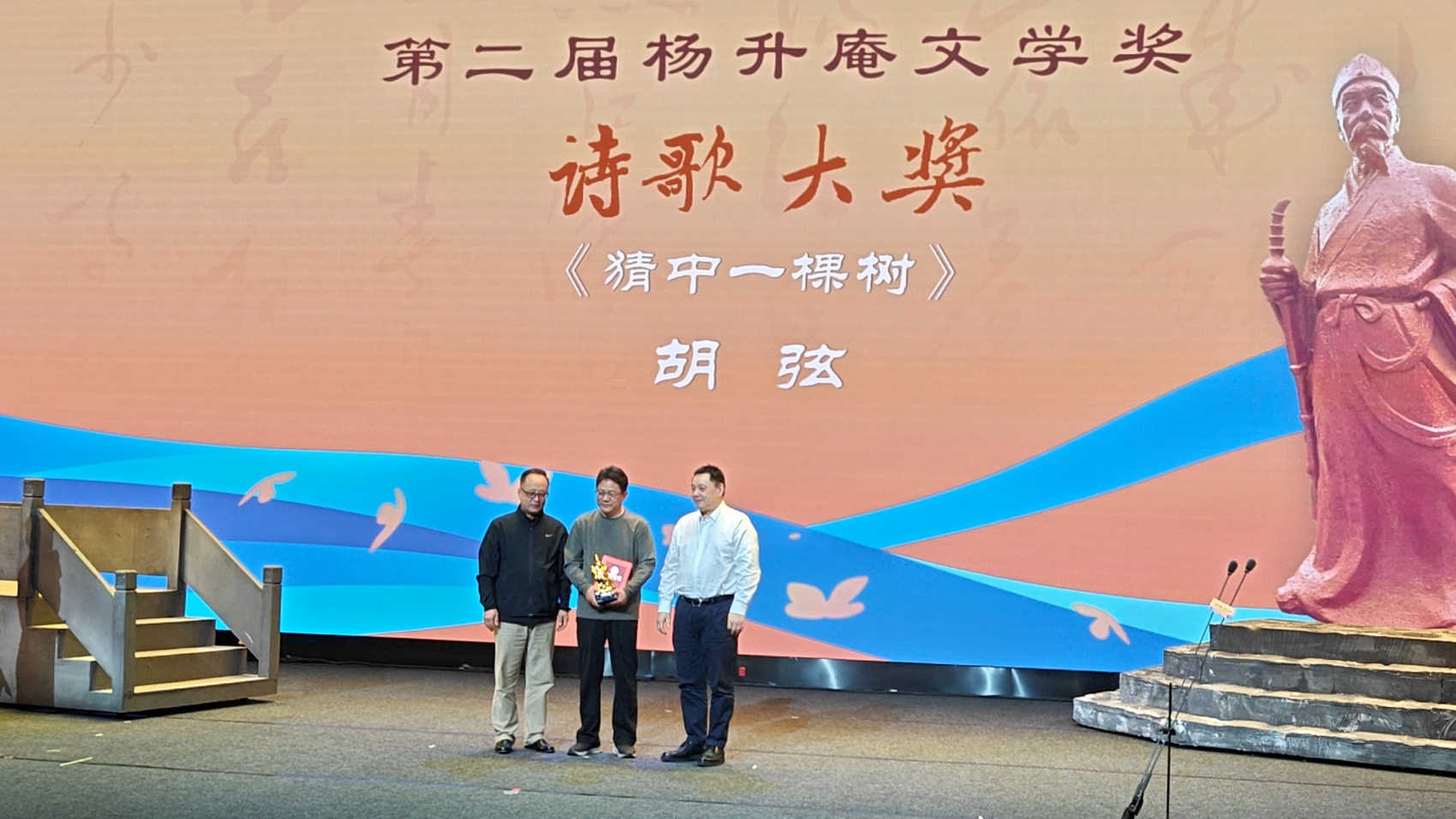 10月13日,第二届杨升庵文学奖颁奖典礼在成都新都区举行,诗人胡弦凭借诗集《猜中一棵树》荣获诗歌大奖。