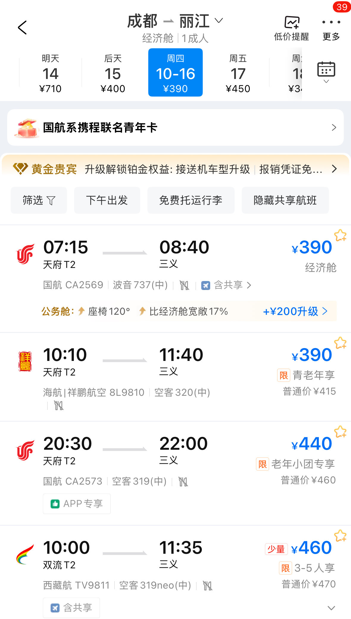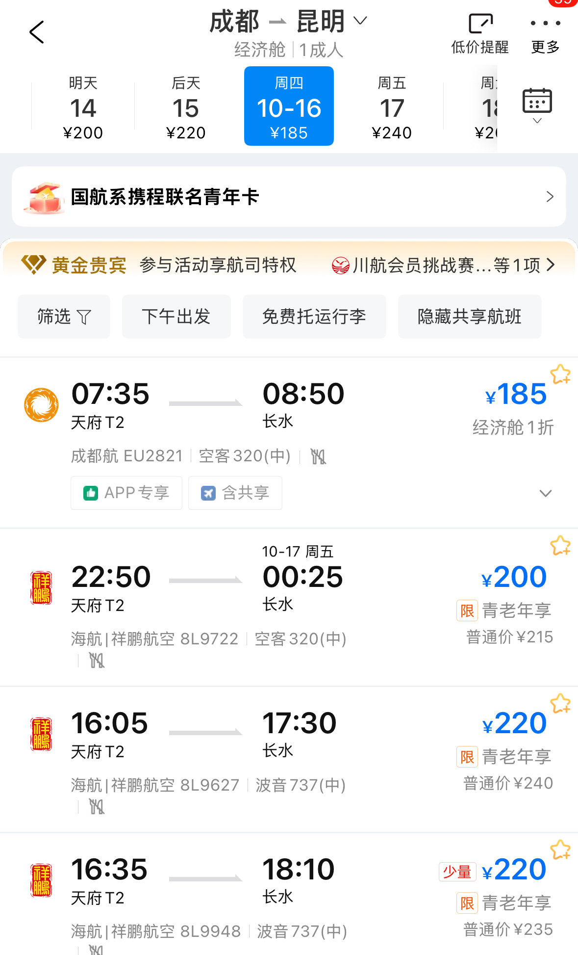作为西南地区的重要出行枢纽,成都出发的机票价格同样大幅下降。记者在第三方售票平台上看到,10月16日从成都飞往兰州机票价格最低仅需290元;10月16日从成都飞往昆明最低仅需185元。