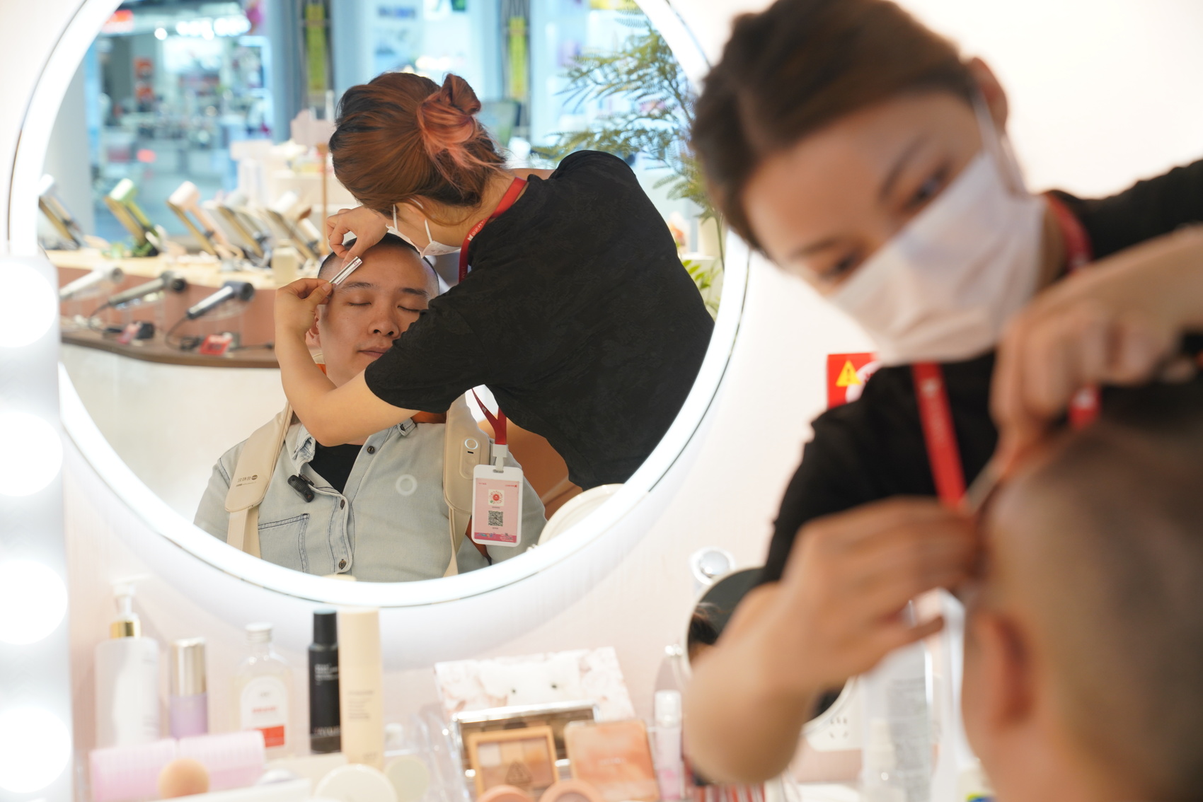 记者体验边按摩边修眉。