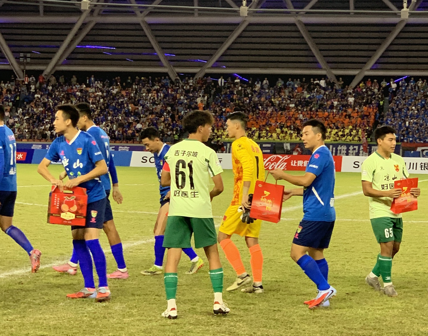 在攀枝花,一个个芒果被凉山队员带回。10月12日客场,凉山队也获得了乐山队回赠的甜皮鸭。在10月2日的凉山主场比赛前,凉山队向对方赠送了盐源苹果,眉山队回赠了龙眼酥,以此作为友谊的见证。当天,凉山还在比赛场地凉山民族体育场外,设置了农文商市集,30个展台展出了大凉山优质特色农产品、商品,展示各类美景、美食,吸引了众多球迷和游客参与。