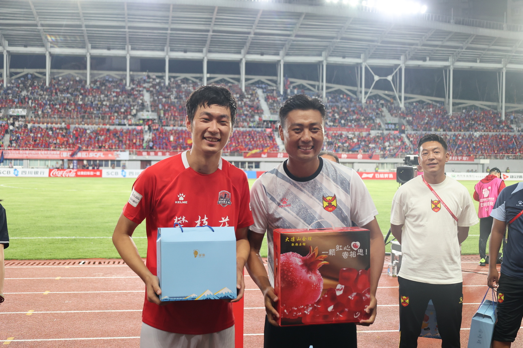 此前,9月27日,在首轮比赛客场对阵攀枝花队时,凉山队球员们就为对手送上了礼物——刚刚上市的会理石榴。当攀枝花的晚风遇见会理石榴,玛瑙般的籽粒在齿间绽开,那是大凉山用阳光酿造的蜜语。