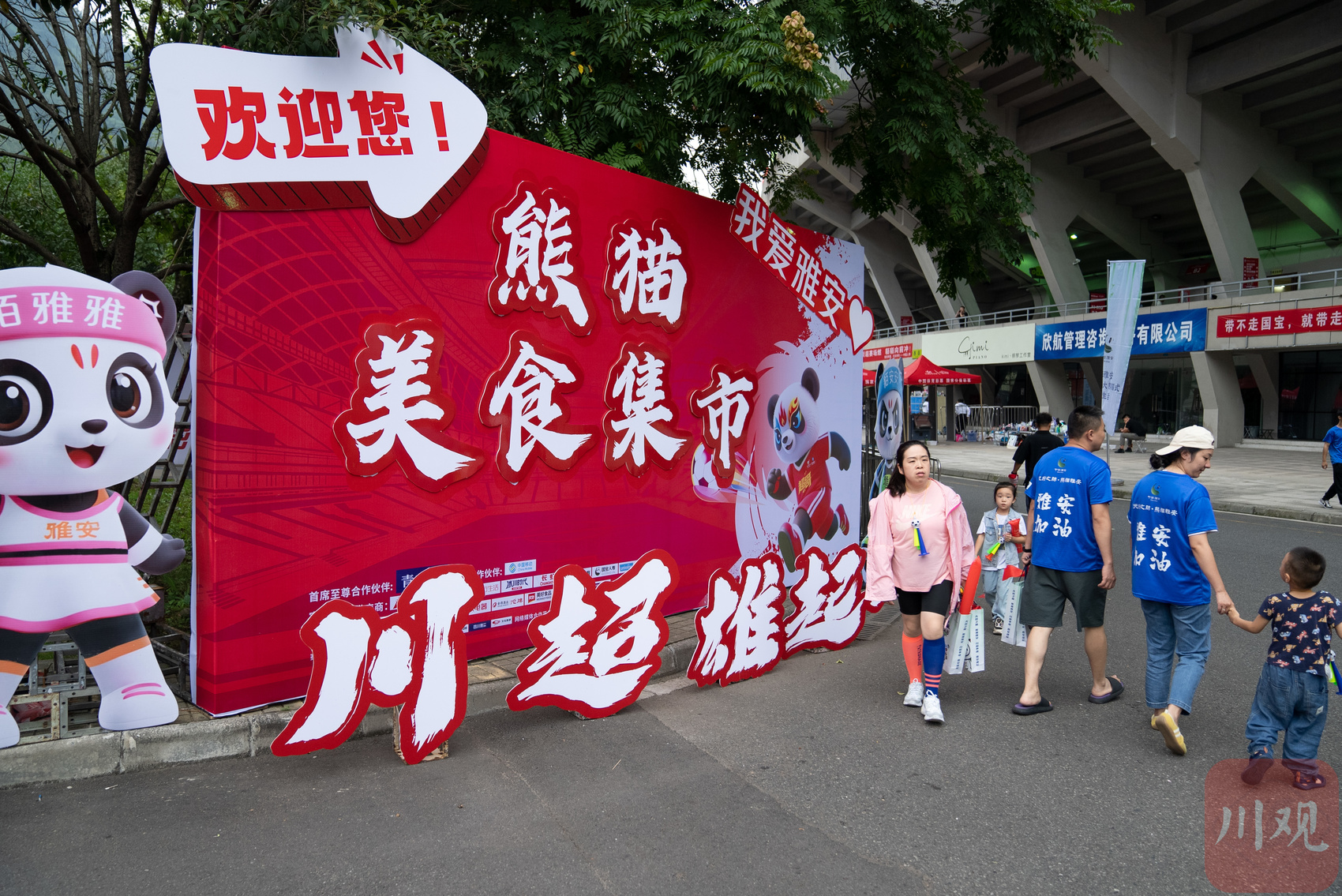 9月27日雅安主场迎来“川超”首战时,体育场外设置的美食集市观赛区。李强 摄