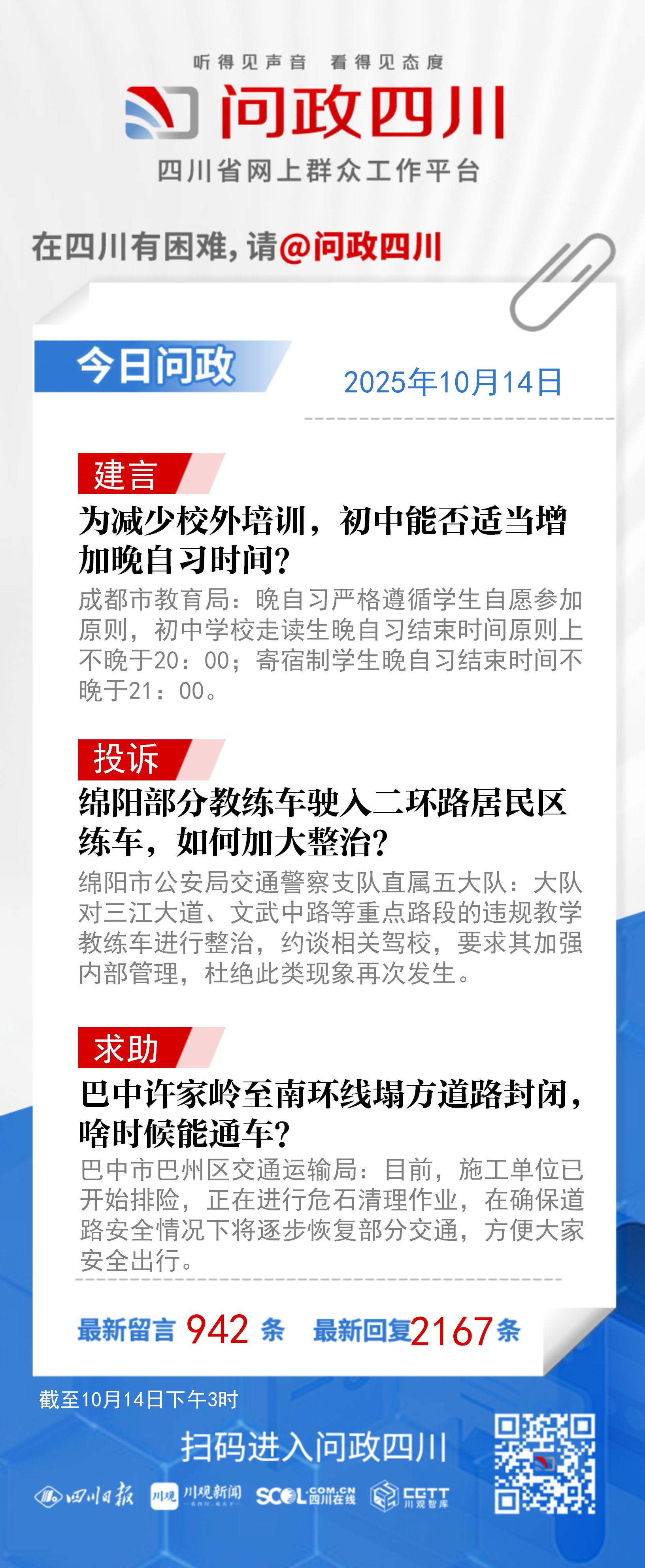 问政四川网友提问:根据当下中学学生学习需求增长的实际情况,在学生和家长自愿的前提下,初中学校是否可以适当增加晚自习时间?这样对学生个人、家庭及学校而言均有益处,能有效制止家长为孩子再找校外培训。