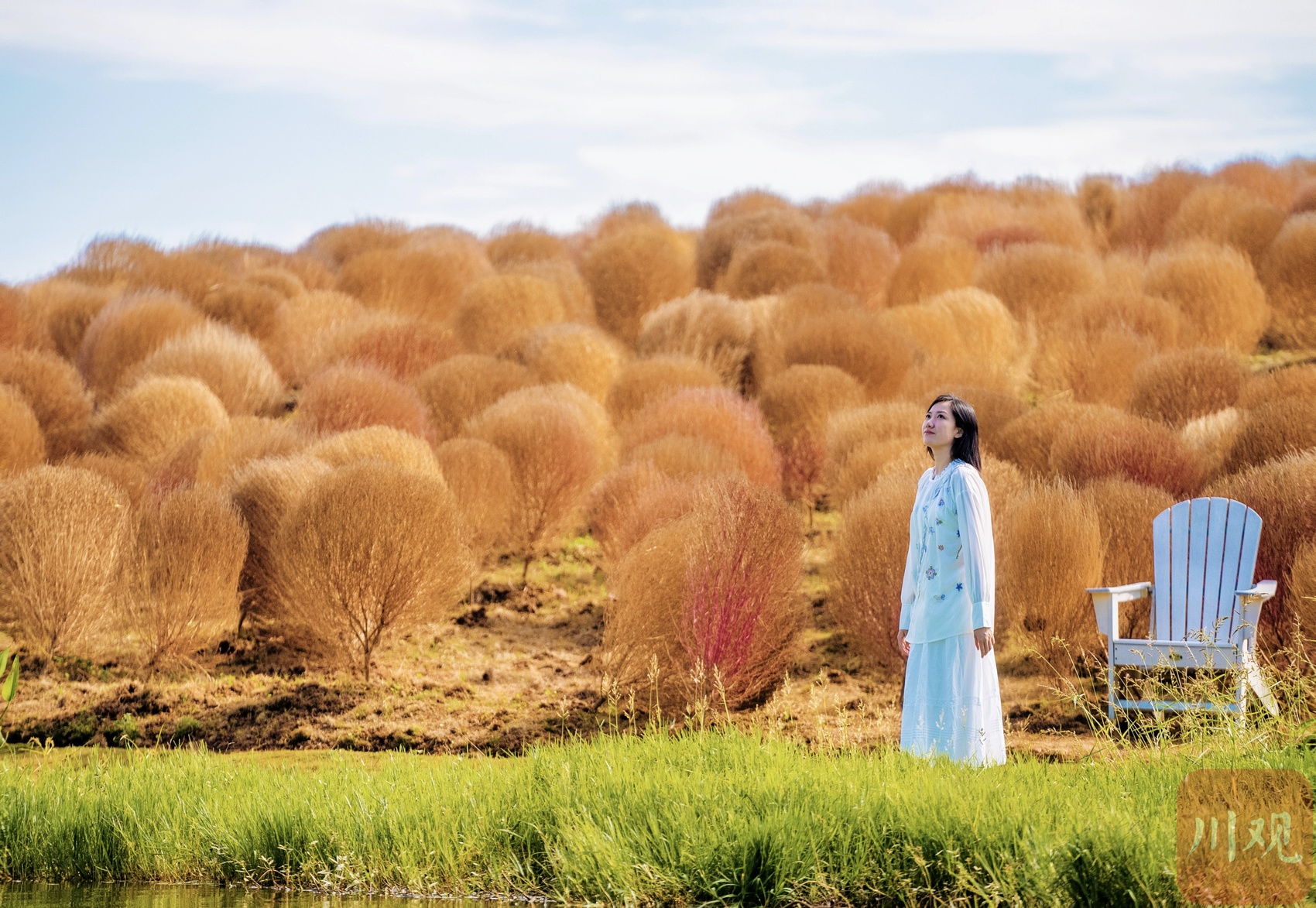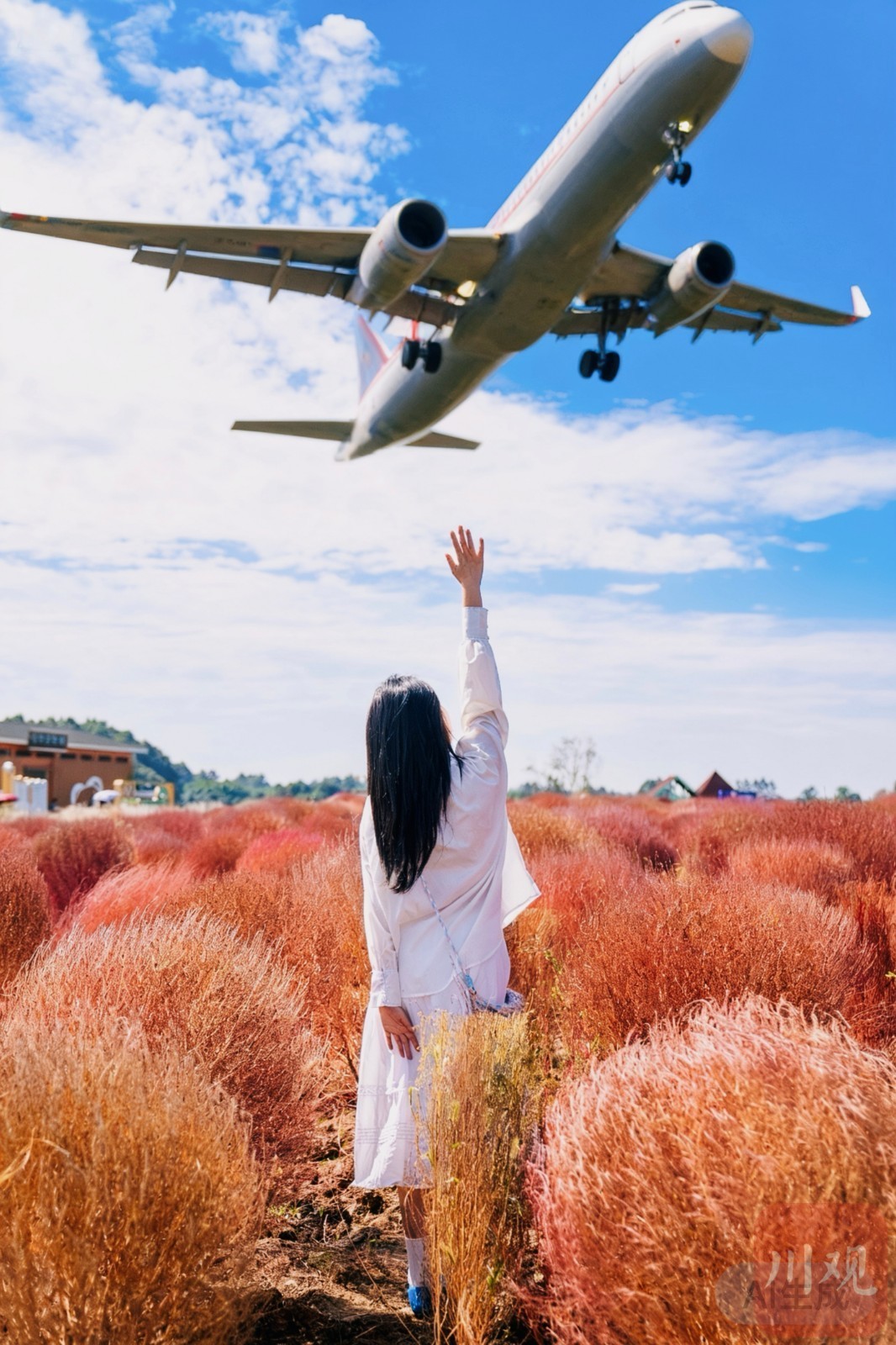 谁说城市没有诗意?成都人把秋日过成了大地艺术,地肤草与航班同框,是现代与自然最温柔的和解。