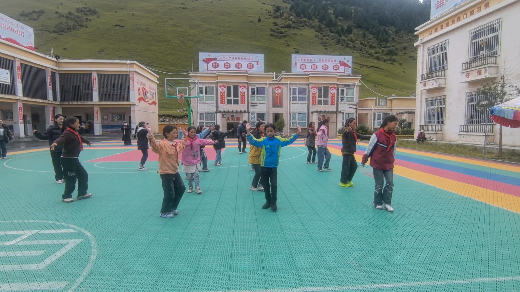 车辆缓慢驶入,但见三栋小楼和一间平房围成的院子里,塑胶地板拼成的篮球场内,男孩打篮球、女孩练舞蹈。见我们到来,数学兼体育老师泽郎格西轻轻地把球扔给孩子,朝我们走来:“欢迎来到格木小学。”