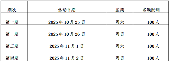 本次活动共分四期举行,均为全天活动(具体时间约为09:30-16:00)。名额有限,每场先到先得。请根据您的空闲时间选择合适的场次。