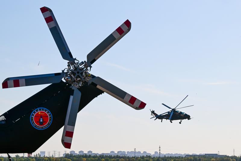 10月14日,第七届中国天津国际直升机博览会举行媒体探馆活动,图为参加飞行表演的直升机进行演练。
