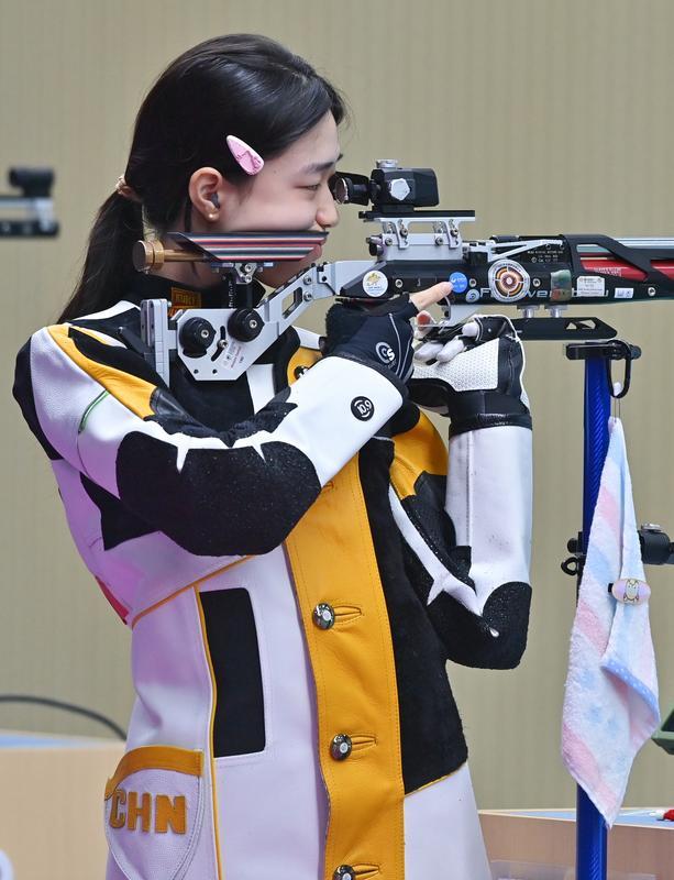 10月14日,第十五届全运会女子10米气步枪团体决赛在广州举行。最终,浙江队夺得冠军。图为浙江队选手黄雨婷在比赛中。