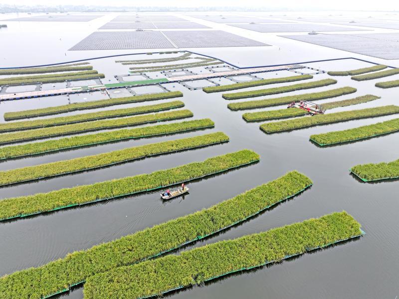 近日,安徽省淮南市凤台县顾桥镇采煤沉陷区50亩漂浮式水稻迎来丰收。当地积极探索采煤沉陷区综合治理开发利用,在采煤沉陷区推行水面漂浮水稻种植、水下网箱养鱼、水上光伏电站等多种发展模式,科学利用好采煤沉陷区。
