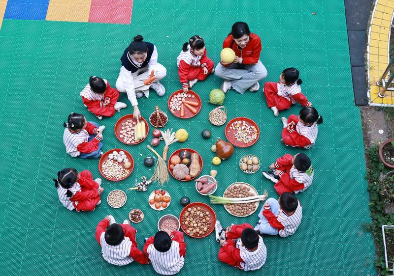 临近世界粮食日,各地开展世界粮食日主题活动。图为10月14日,武汉市洪山区实验幼儿园小朋友在老师指导下学习辨识粮食。