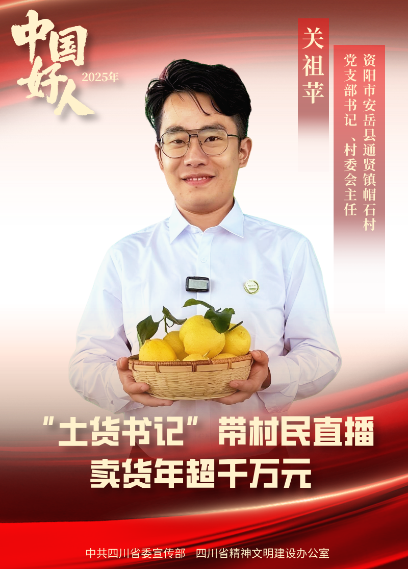 资阳市安岳县通贤镇帽石村党支部书记、村委会主任关祖苹被网友亲切称为“土货书记”。他注册“四川关支书”账号,以“西装+军大衣”的反差形象圈粉,把直播间变成“乡村综艺秀”,半年成功带货260万元,2024年底直播间销售额突破1000万元,让直播成为村民增收的“新农活”。他还带动川渝90多名村支书开展助农直播1500余场次,助力农产品销售额超4000万元,帮助近百个偏远乡村找到了乡村全面振兴新路径。