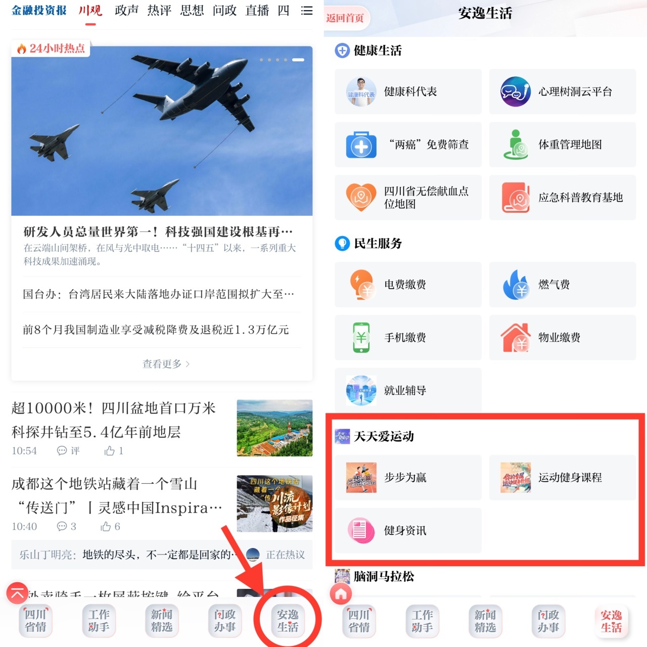 打开川观新闻App,首页右下角点击“安逸生活”按钮,进入下滑找到“天天爱运动”,点击即可进入。