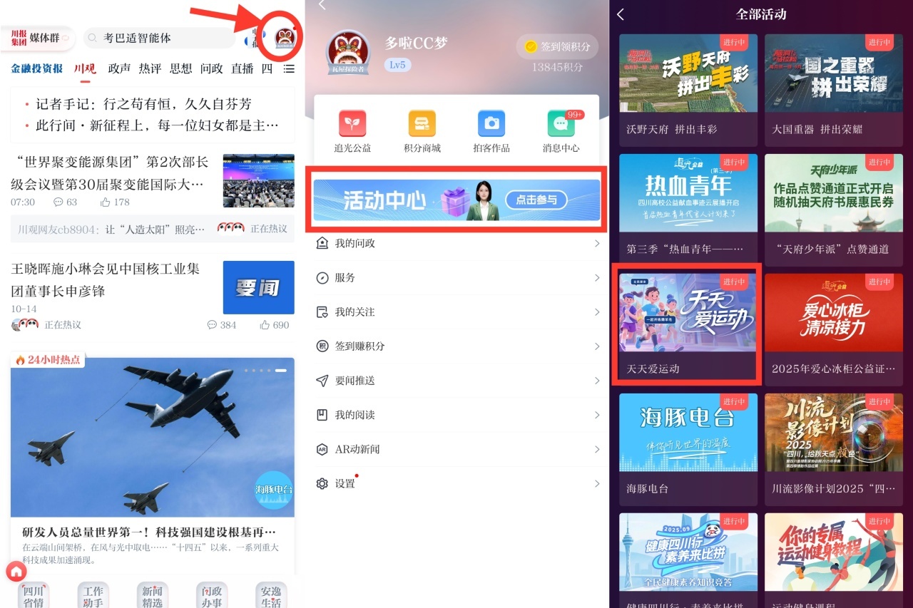 打开川观新闻App,首页右上角点击“我的头像”按钮,选择“活动中心”,进入找到“天天爱运动”,点击即可进入。