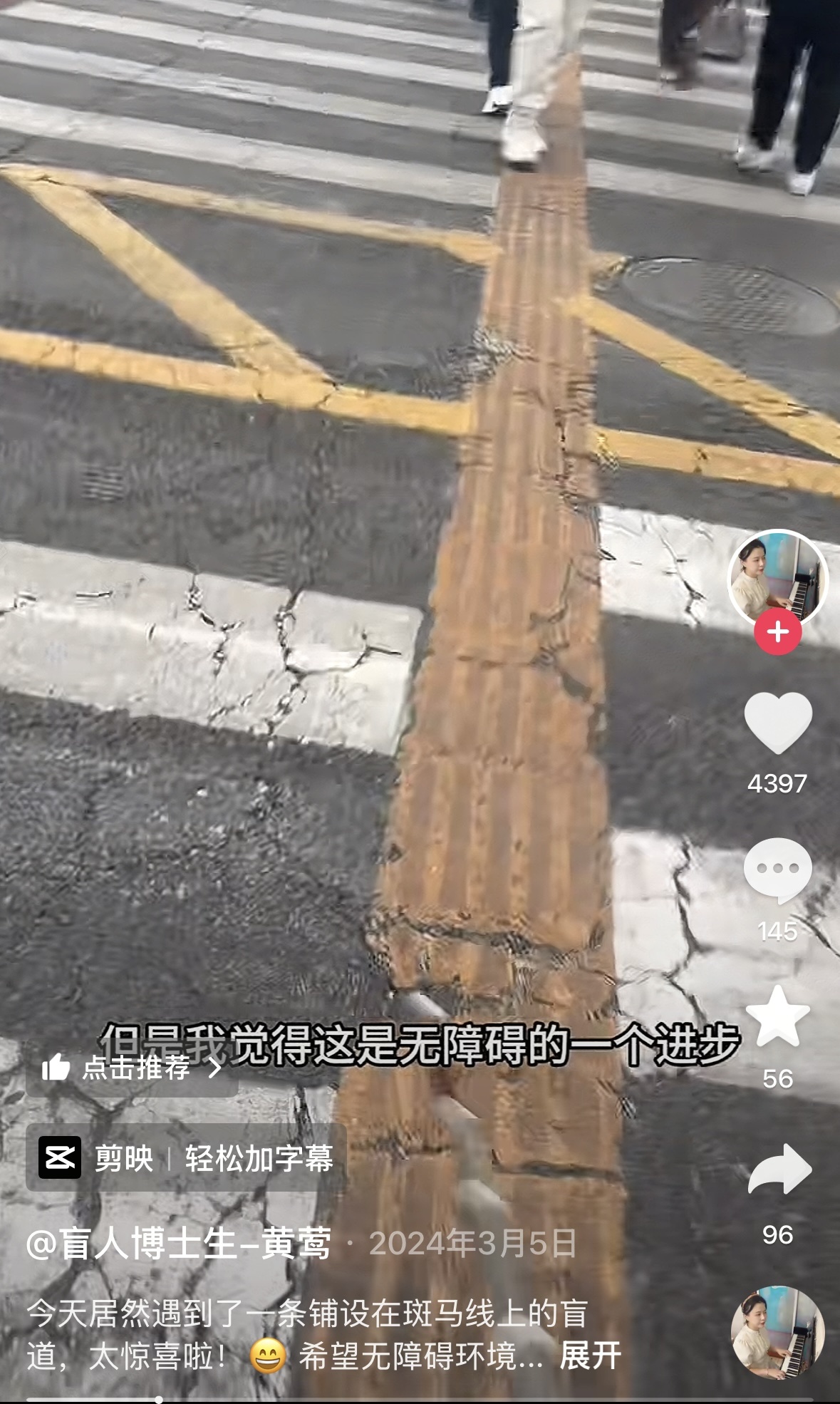 盲人博士黄莺记录出行中遇到的盲道斑马线
