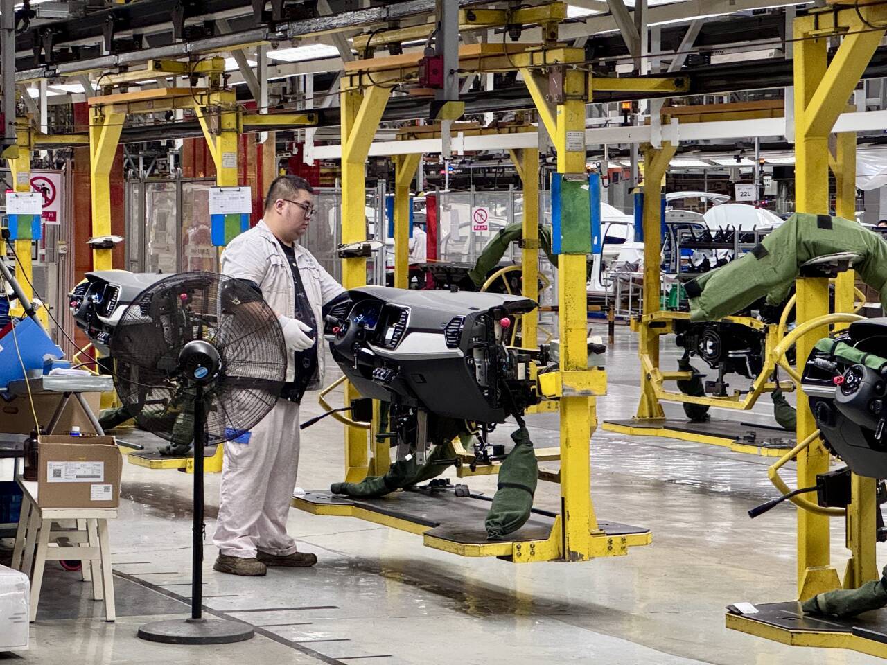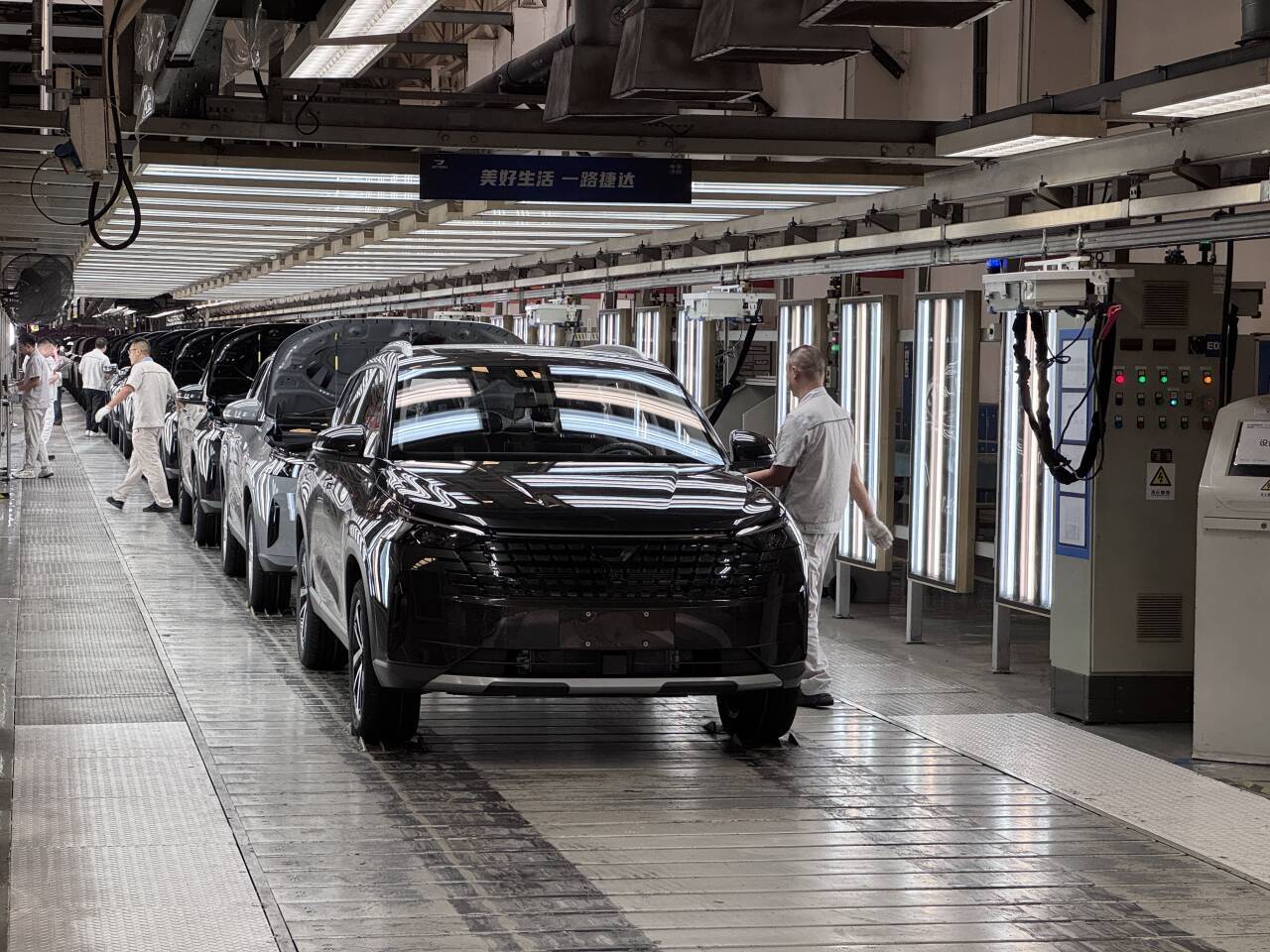 机械臂精准探下,将沉重的车门、挡风玻璃稳稳抓起,再分毫不差地嵌入车身;底盘合装工位上,升降平台将发动机、悬架等整体托起,与下降的车身严丝合缝地对接;工人们手持工具敲击车窗做最后的检查,动作娴熟而富有节奏……
