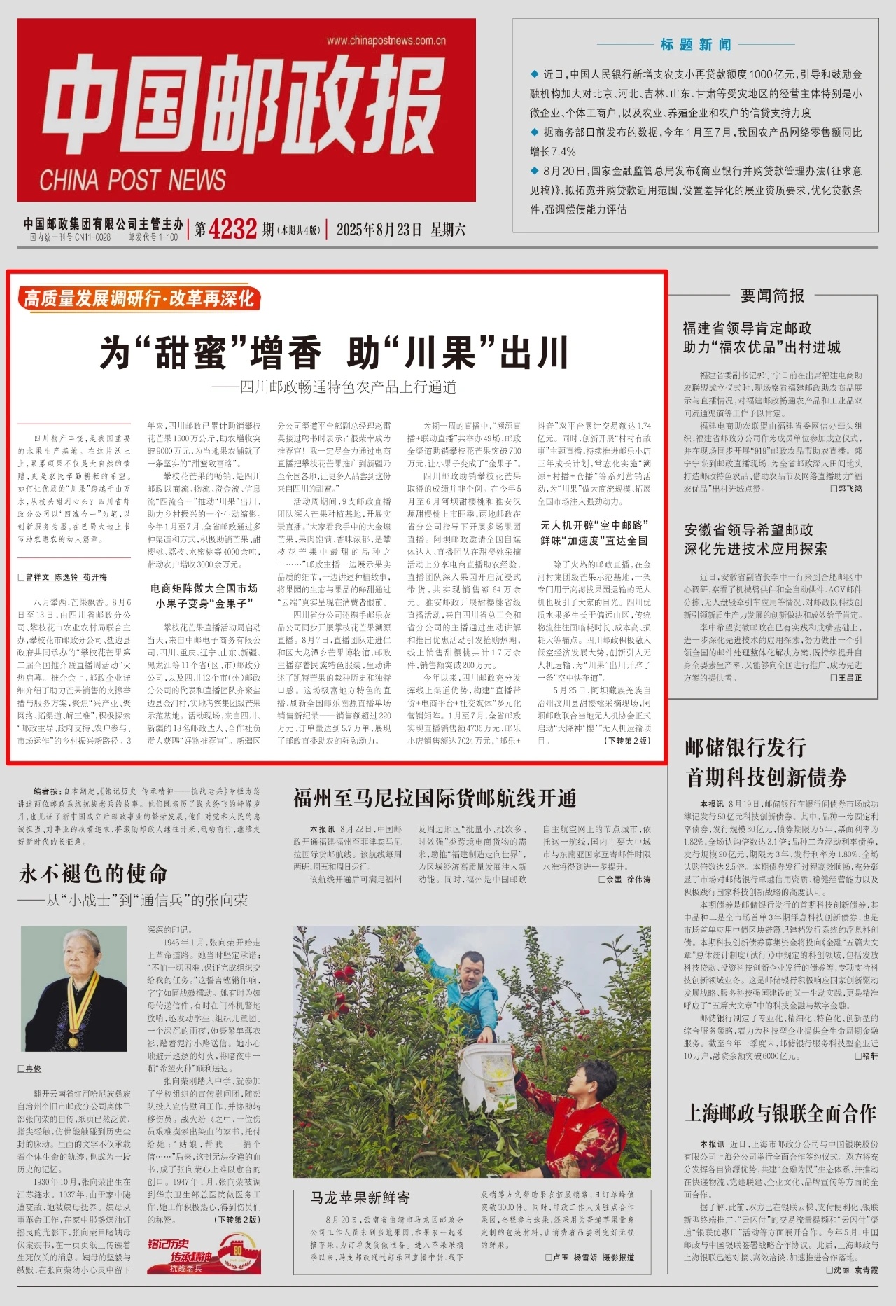 四川是水果生产大省,“川果”品牌闻名全国。中国邮政集团有限公司四川省分公司(以下简称四川省邮政)以“四流合一”为抓手,通过电商直播、无人机运输、普惠金融等创新服务,全力推动“川果”出川,助力农户增收致富,持续擦亮四川农业大省“金字招牌”,深度服务乡村振兴战略。8月23日,《中国邮政报》头版头条刊发四川省邮政助力“川果”出川的深度报道,全文如下。