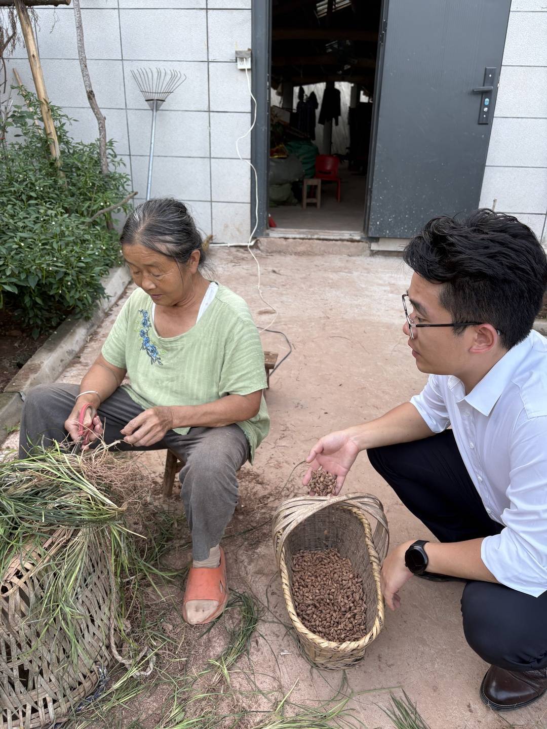 关祖苹(右)到村民家查看农产品。