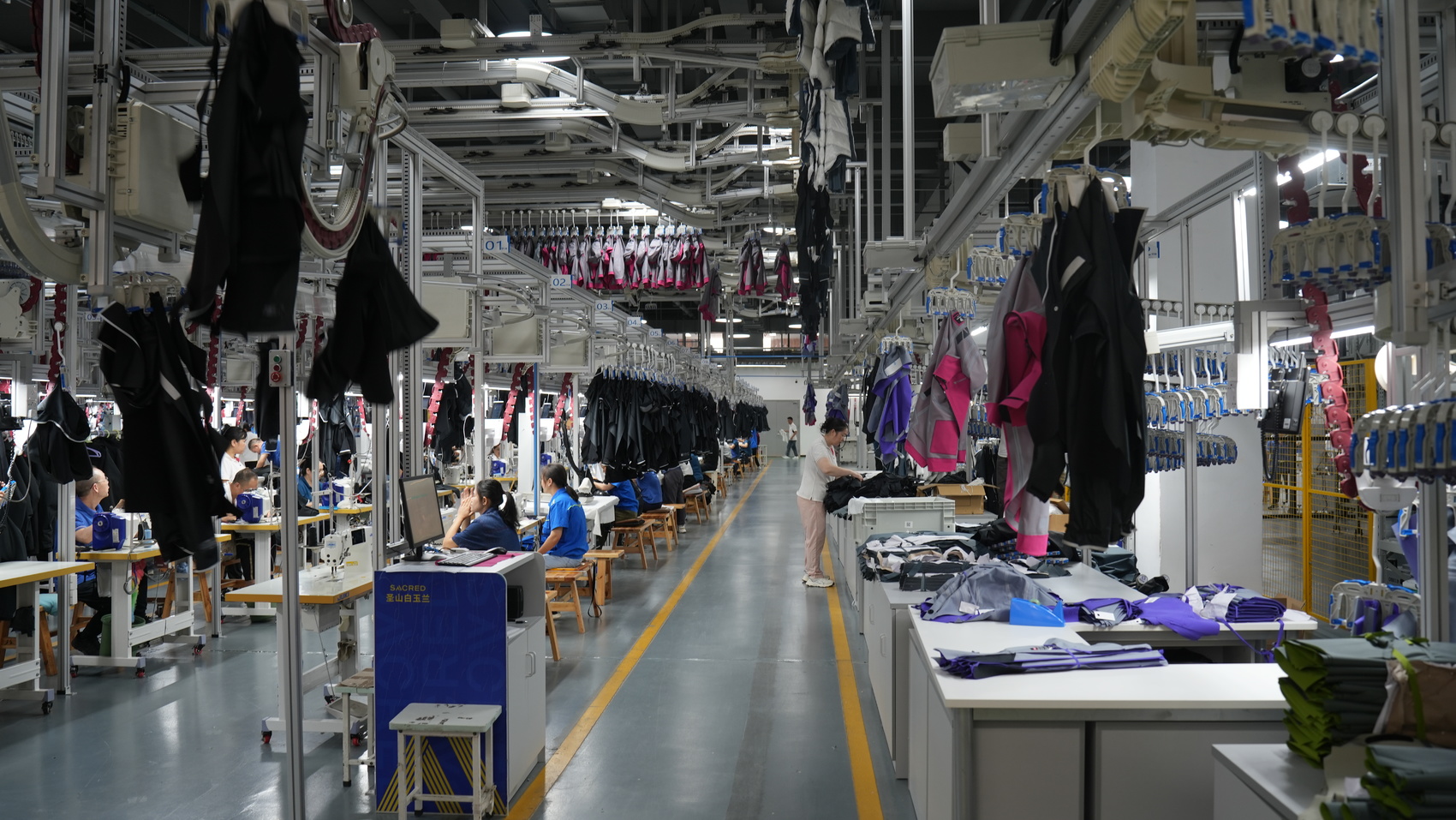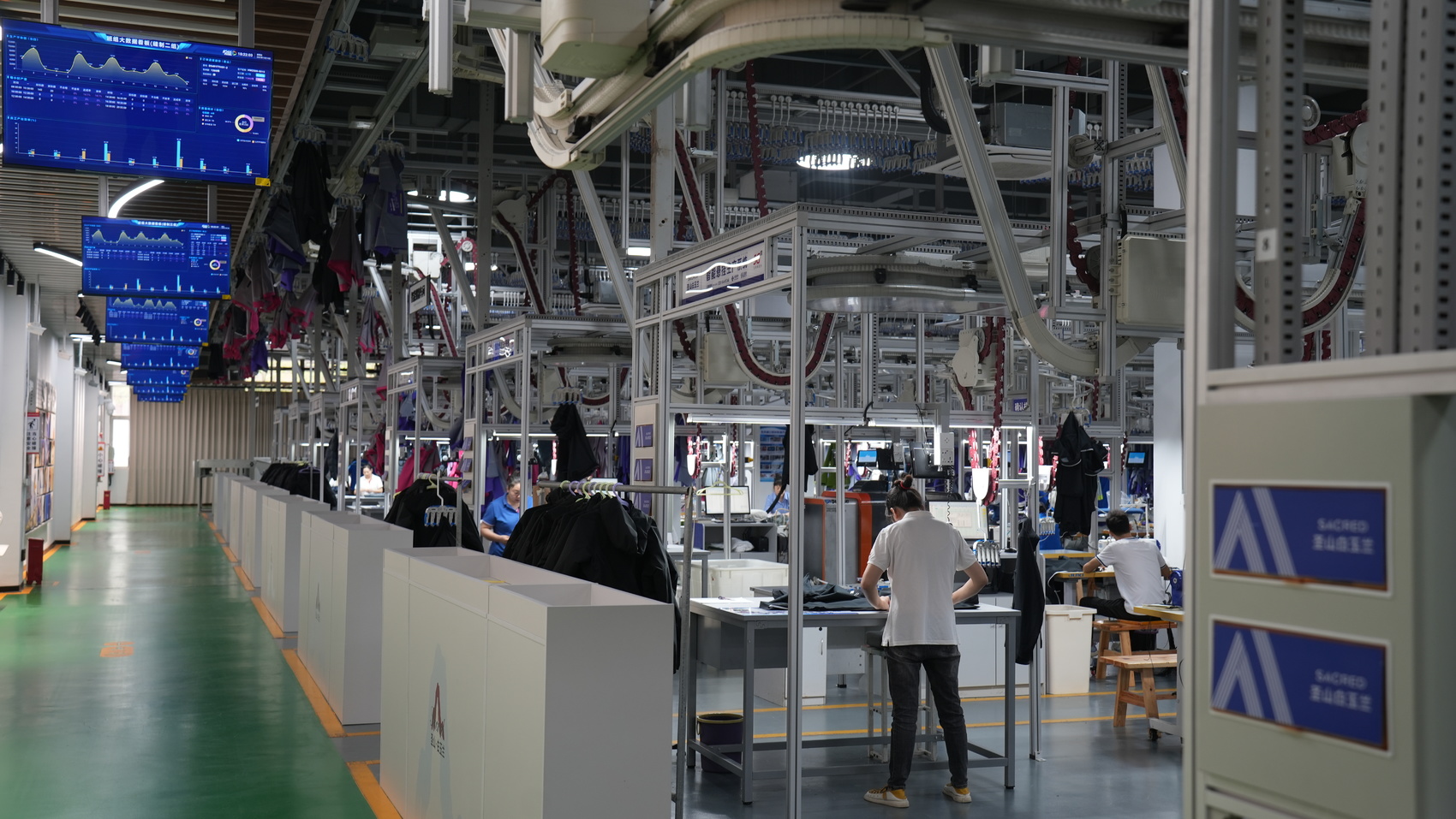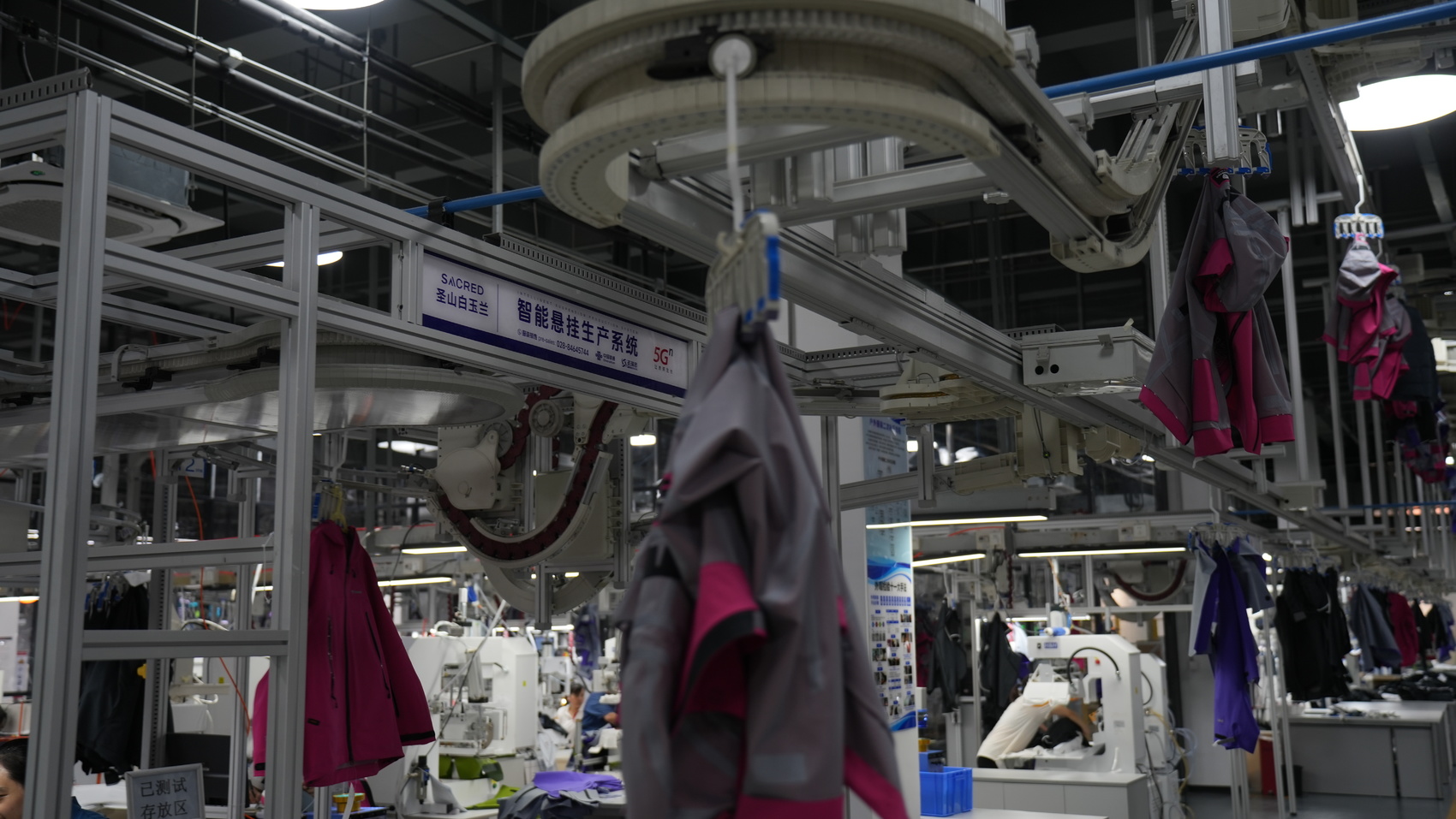 “过去是人找衣服,现在是衣服找人,系统一定程度上重塑了服装生产流程。”林立航介绍,吊挂系统上每个衣架都带有识别芯片,相当于为每件产品配备了独立“身份证”。凭借这个 “身份证”,衣架能按系统预设路径流转——从首站出发后,按照工序前往工人工位,完成后再前往下一个工位,在制品实现“不落地”自动流转。