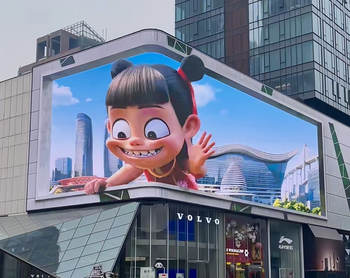 紧接着,5月,哪吒形象以裸眼3D形式全球首秀,同时亮相交子商圈的成都悠方购物中心大屏、春熙路商圈的兰博基尼大屏和太古里大屏。在裸眼3D视频中,哪吒在有天府双塔、环球中心、天府立交等成都标志性建筑的背景中出现,探出脑袋、瞪大双眼,挥手跟屏幕下的观众打招呼。震撼的视觉效果吸引无数路人驻足拍照,社交平台上,“哪吒裸眼3D首秀”话题持续发酵走红。