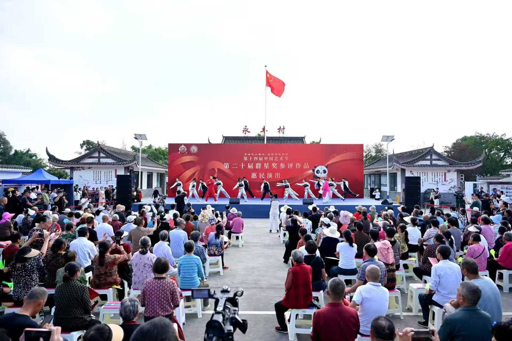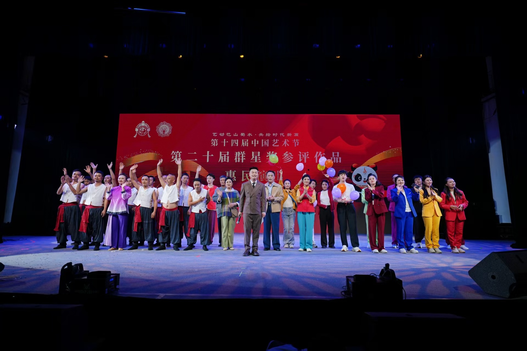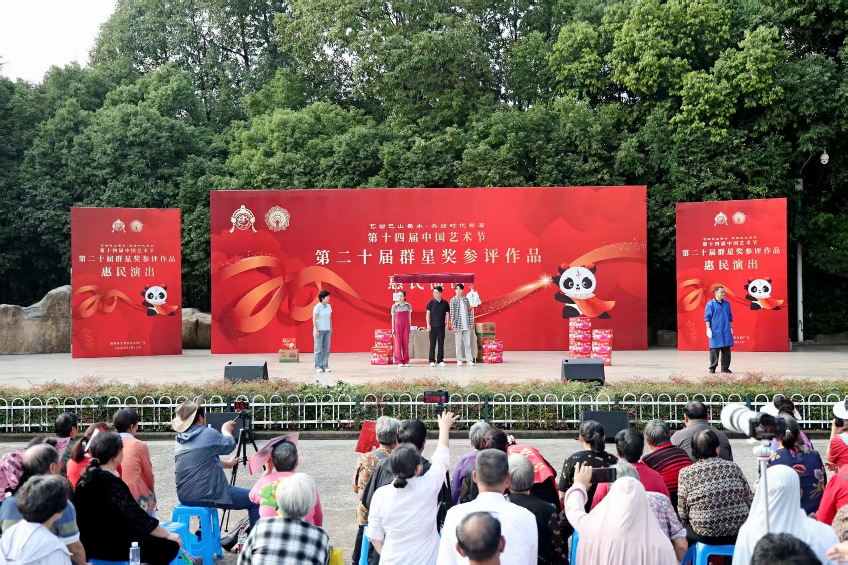 10月15日,第十四届中国艺术节第二十届群星奖戏剧参评作品惠民演出在遂宁安居区、乐山夹江县、眉山永丰村、资阳三贤文化公园四地同步上演。四场演出汇集了来自全国各地的群众文艺作品,通过小品、戏曲、情景剧、舞蹈等多种形式,将高质量的文化盛宴直接送至剧场、田间与广场,生动践行了“艺术的盛会、人民的节日”这一宗旨,展现了新时代群众文艺创作的繁荣景象。