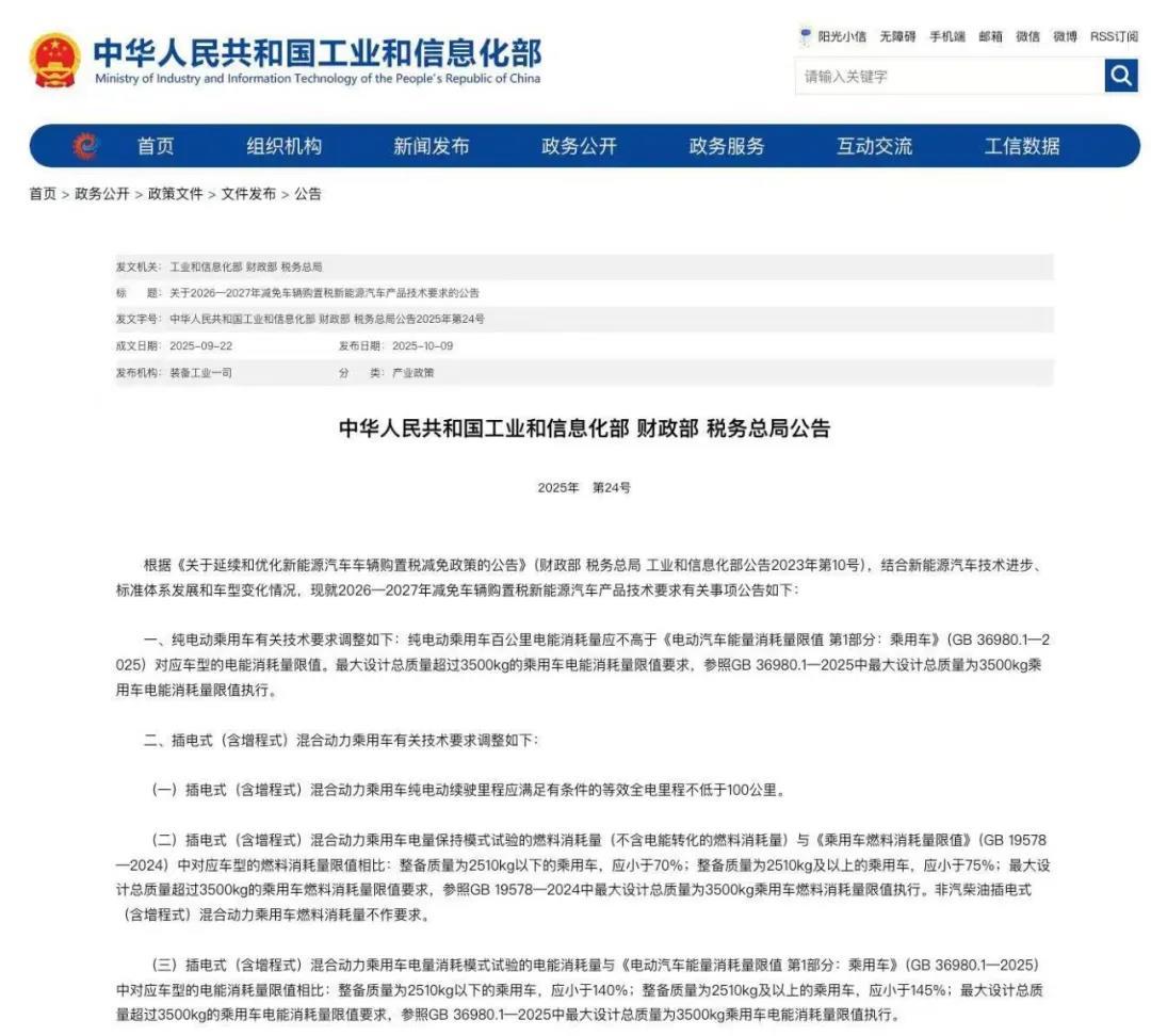 日前,工业和信息化部、财政部、税务总局联合发布了《关于2026—2027年减免车辆购置税新能源汽车产品技术要求的公告》(以下简称“购置税技术要求公告”),明确纯电动乘用车、插电式(含增程式)混合动力乘用车有关技术要求调整等情况。2026年1月1日起,列入《减免车辆购置税的新能源汽车车型目录》的车型,需符合本公告要求。2026年1月1日(含)起,在2026年及以后生效的《减免税目录》发布后,购置列入《减免税目录》的新能源汽车,可按规定享受车辆购置税减免政策。