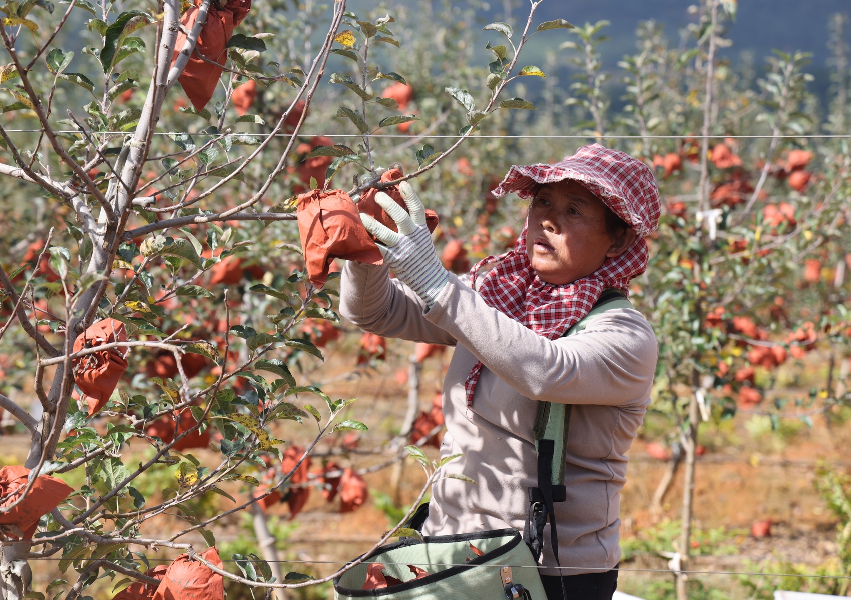 10月13日,在棉桠镇中心村的盐源高标准农业科技发展有限公司基地里,连片果树上硕果累累,工人们有序开展摘果、拆袋、选果、分级、贴标、包装等工作。