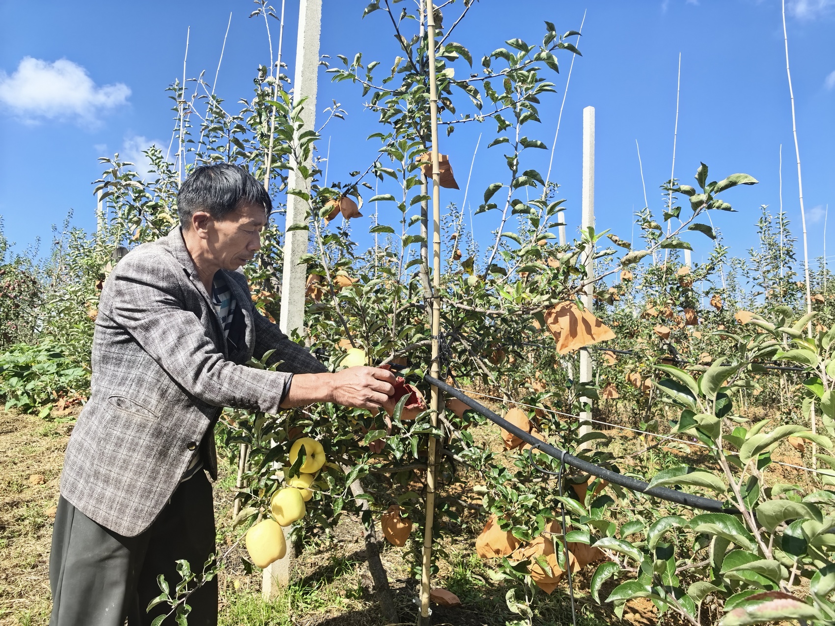 近日,在卫城镇罗家村,果农刘银贵轻轻解开果袋,一颗金黄饱满的苹果在阳光下泛着诱人光泽,果香扑鼻。