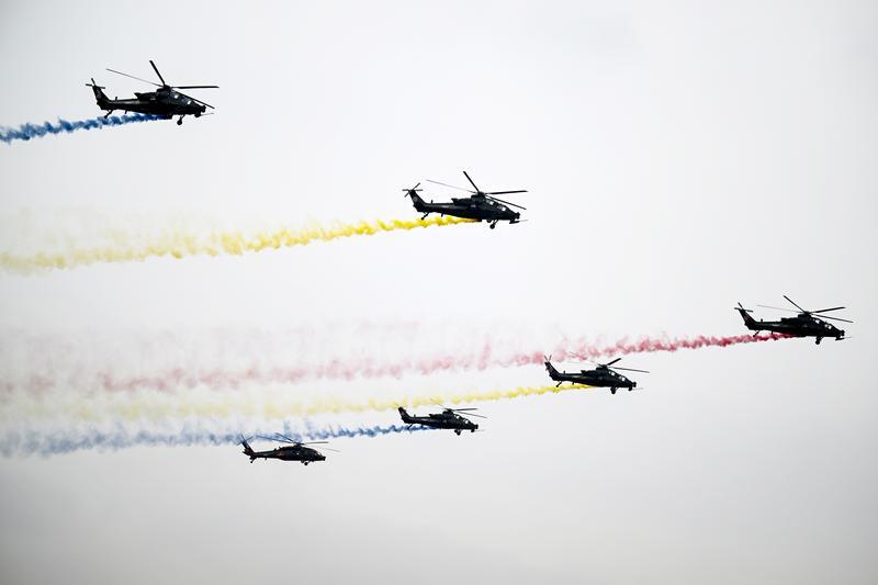 10月16日,在第七届中国天津国际直升机博览会开幕式上,陆军“风雷”飞行表演队进行飞行表演。