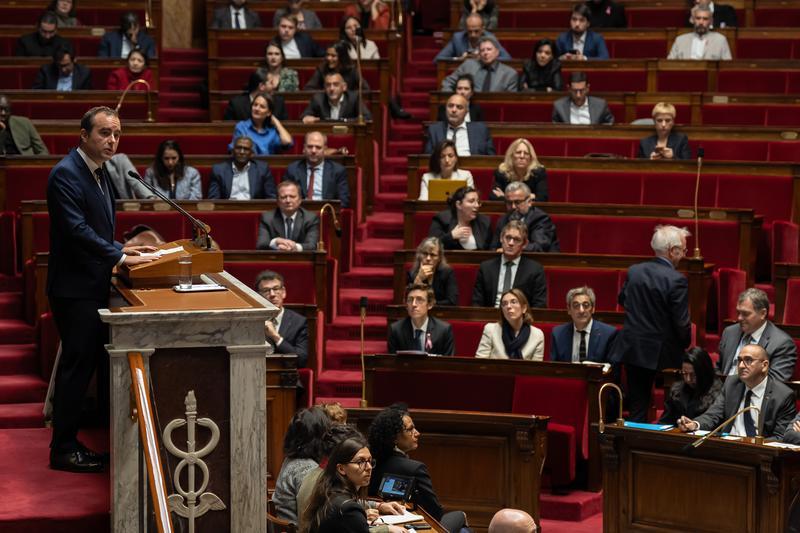 10月16日,在位于法国巴黎的国民议会,法国总理勒科尔尼在不信任动议投票前的辩论环节发言。