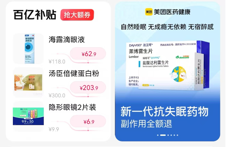 10月15日,记者在美团买药上查询发现,在平台“看病买药”页面,有清晰标注了“新一代抗失眠药物副作用全额退”字样。据美团买药相关负责人介绍,“副作用全额退”是指用户在美团平台或“美团买药”小程序购买GLP-1及失眠类指定药品后21天内,如因药物产生副作用,可凭医院出具的确诊病历单,申请退货退款,平台将为用户提供药品订单免单(全额退款)及邮费补偿服务。