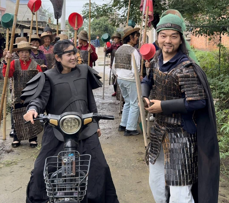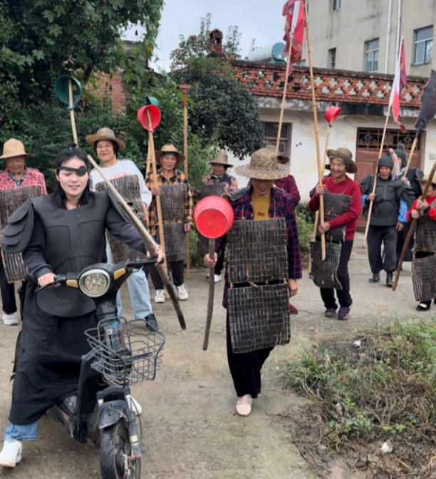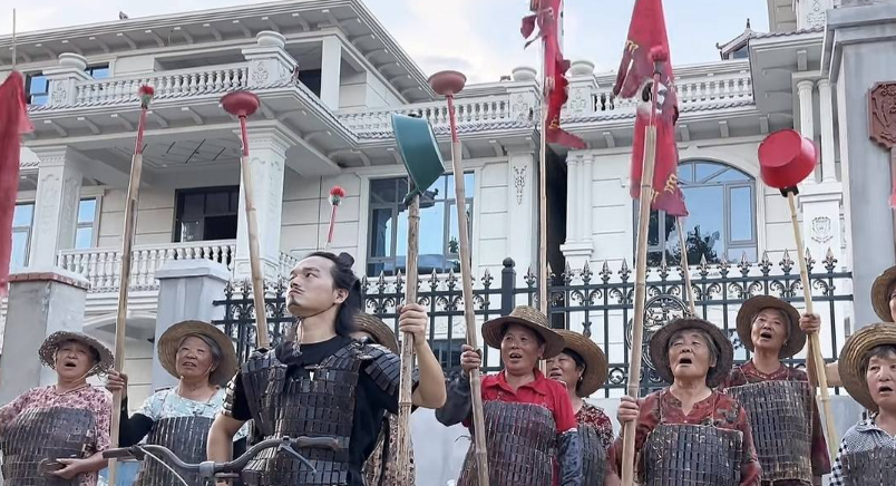 这里,没有专业演员,没有精致道具。村民们头戴草帽“头盔”、身披凉席“盔甲”,手持粪勺当“青龙偃月刀”、举着锅盖做“盾牌”,骑着电动车、自行车演战马“冲锋”……却凭这份接地气的创意,收获全网数十万点赞,让乡村版三国成了热门话题。